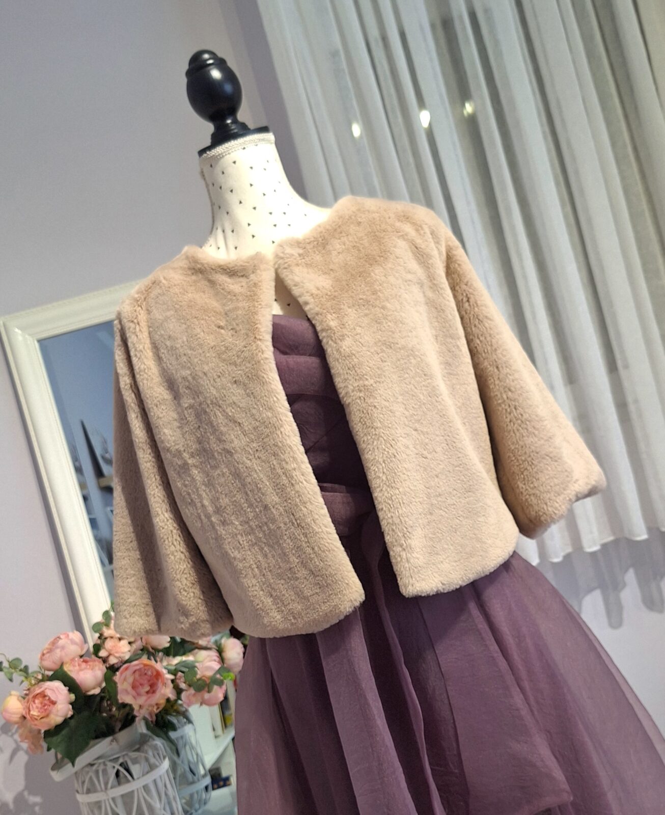 Bundica prljavo roze boje 3/4 rukava, može se zakopčati sa jednom kopčom,
