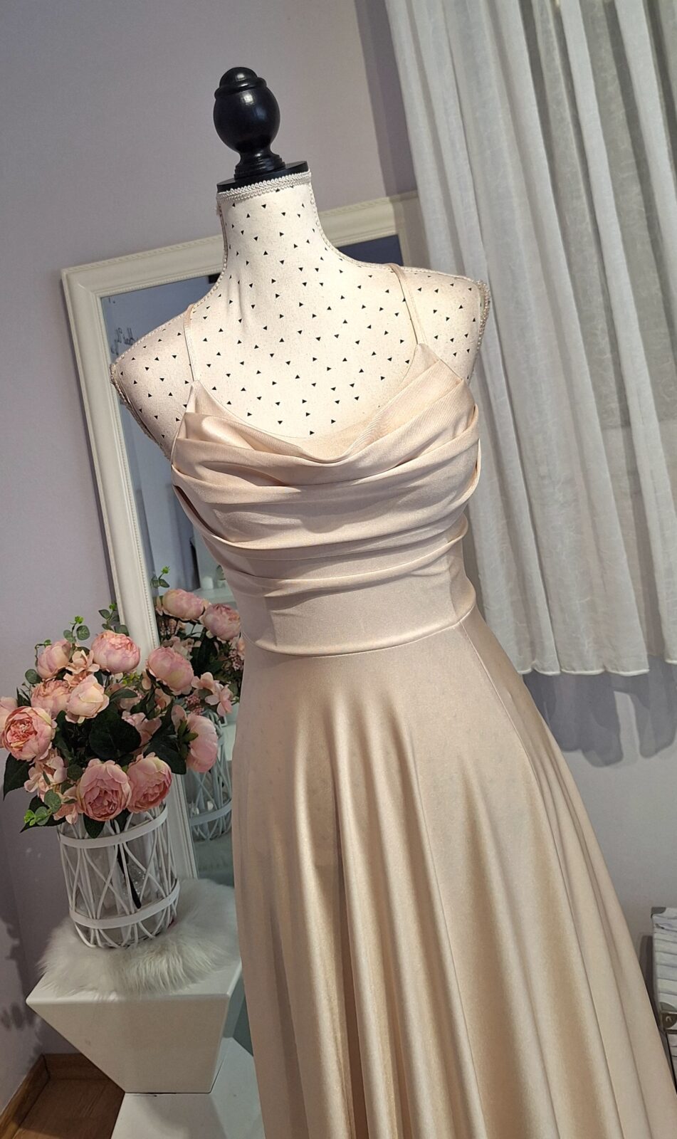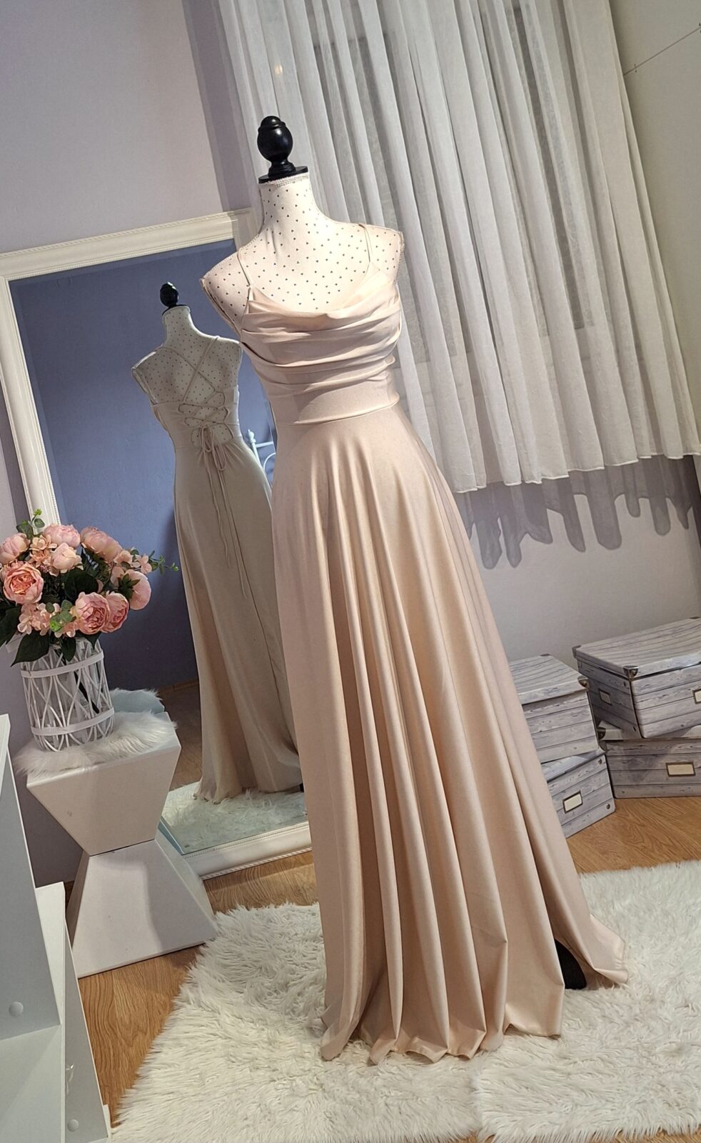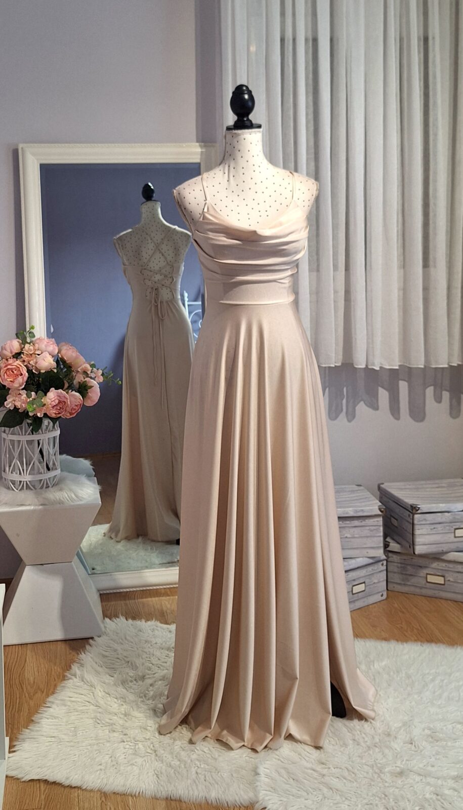 Haljina duga bež boje sa rasporkom, vezanje na leđima