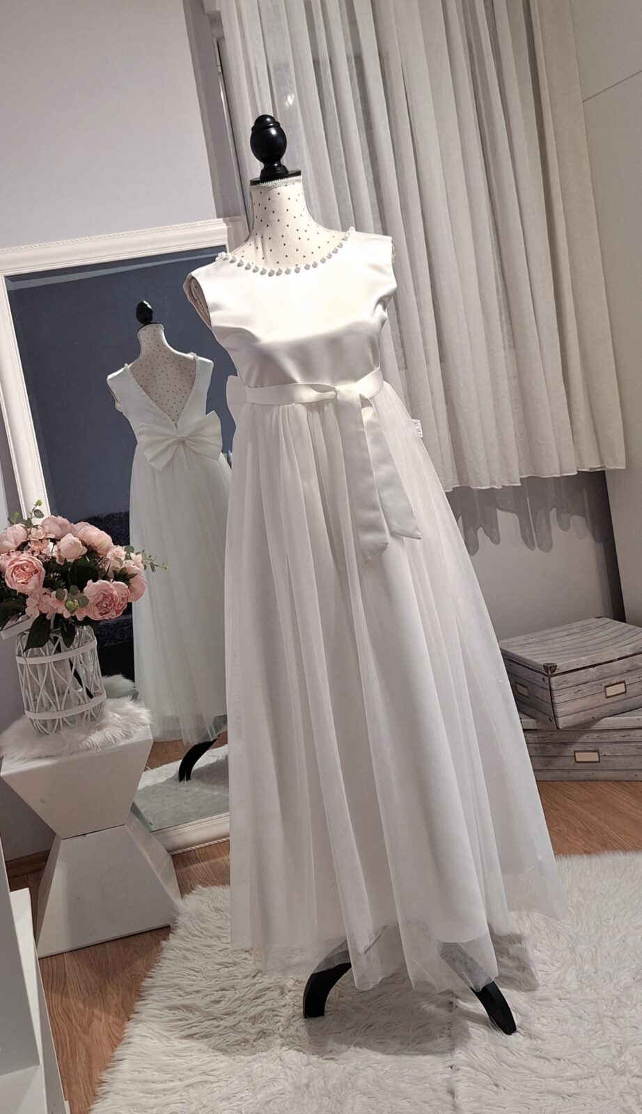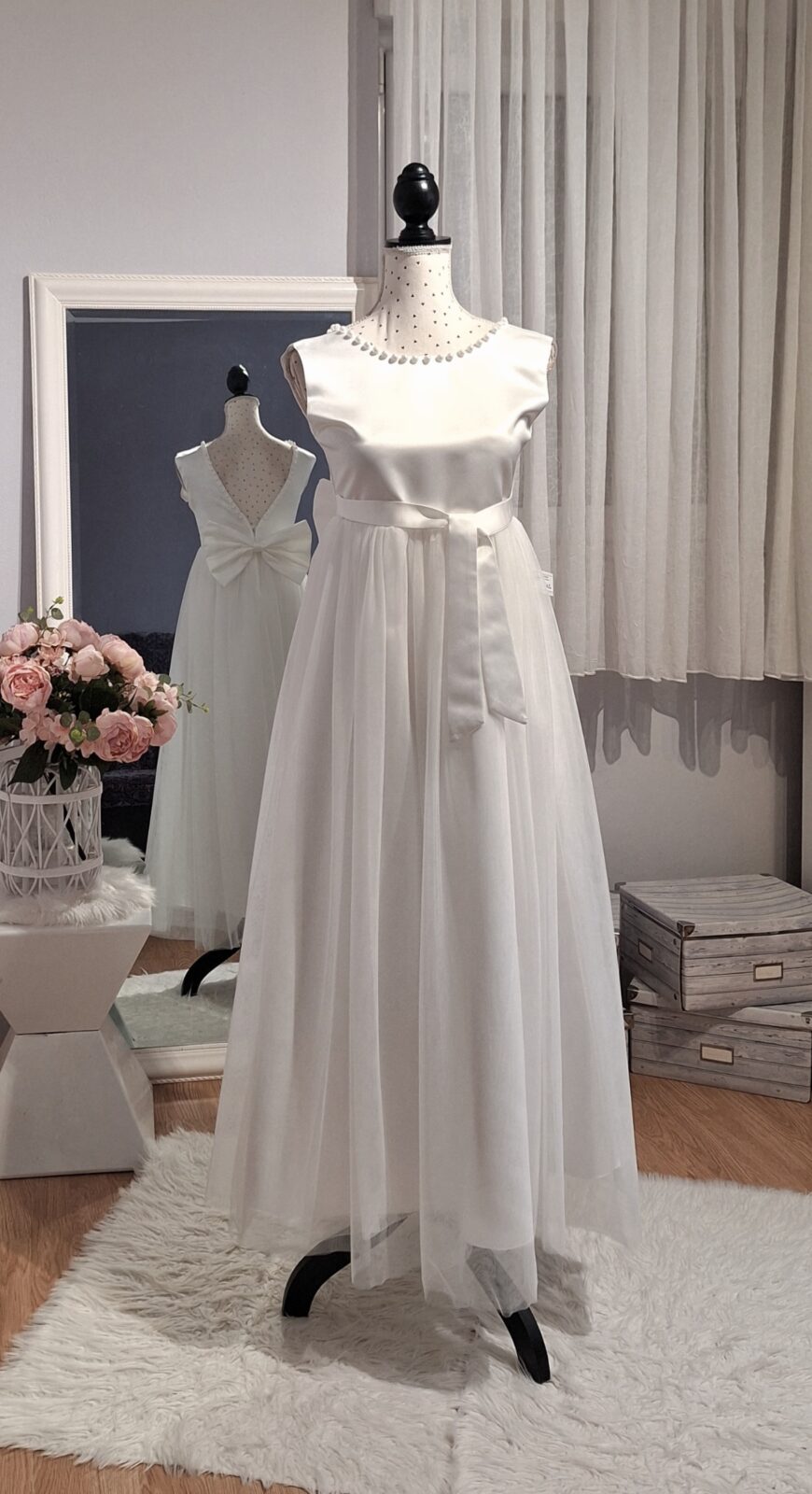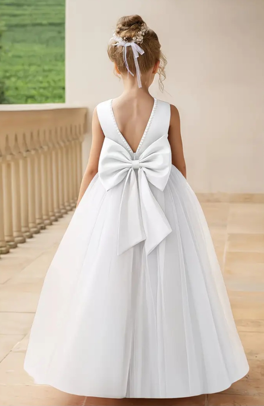 Haljina duga bijela za djevojčice, bijele perlice oko vrata, zatvarač na otvorenim leđima sa velikom mašnom,
