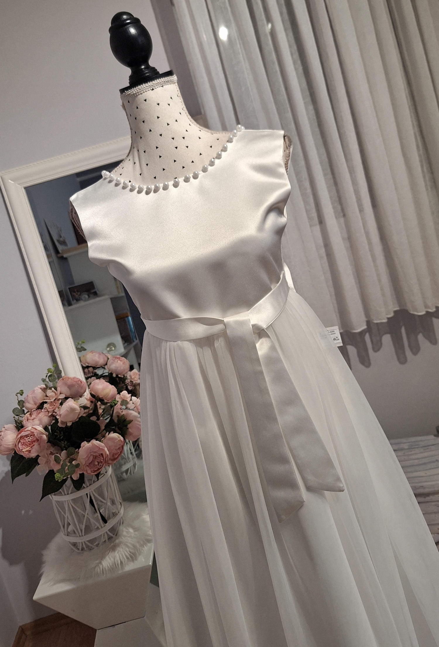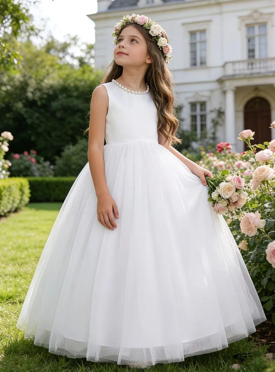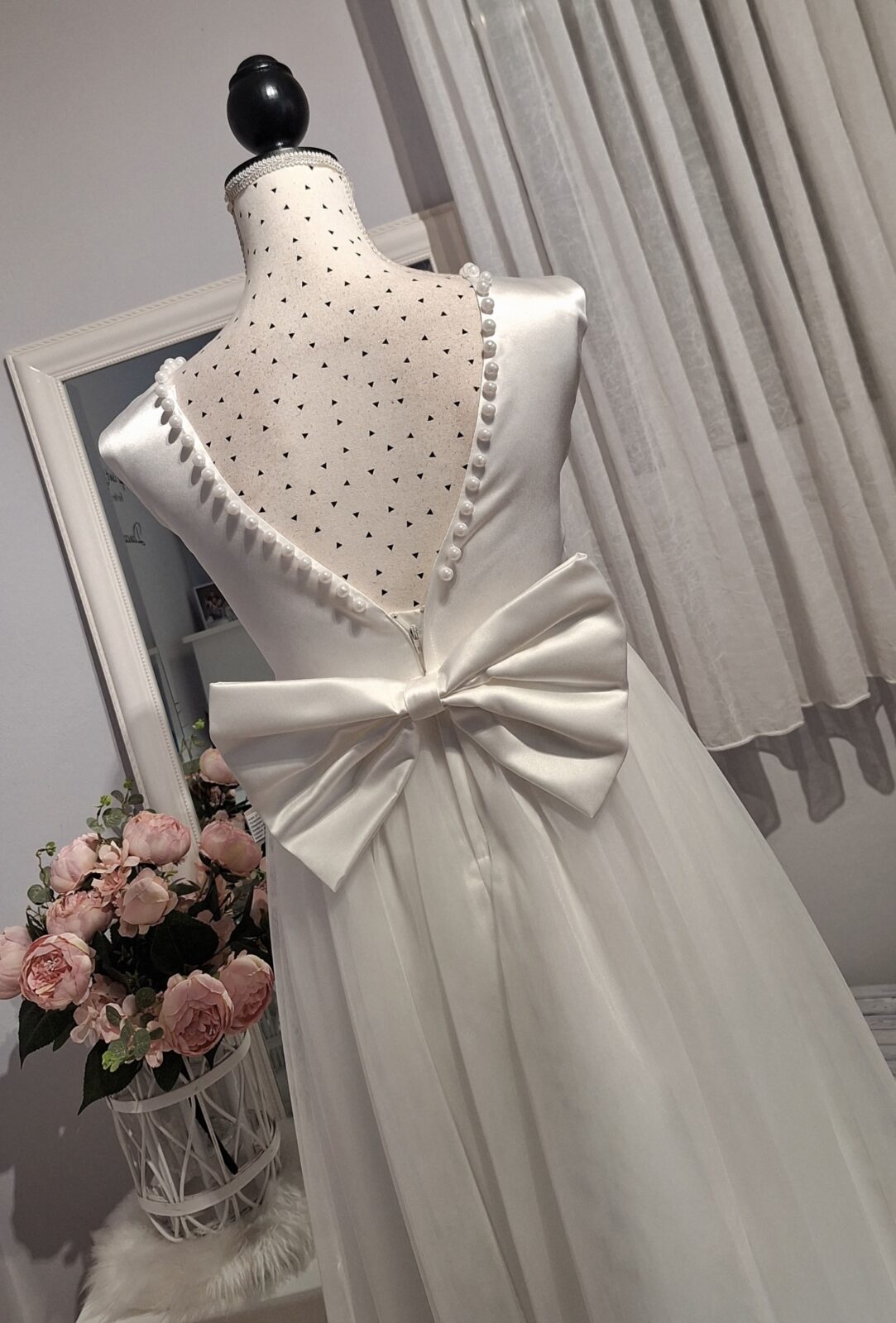 Haljina duga bijela za djevojčice, bijele perlice oko vrata, zatvarač na otvorenim leđima sa velikom mašnom,