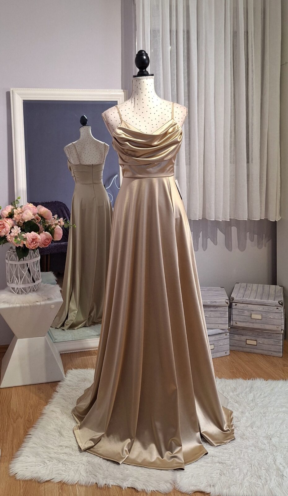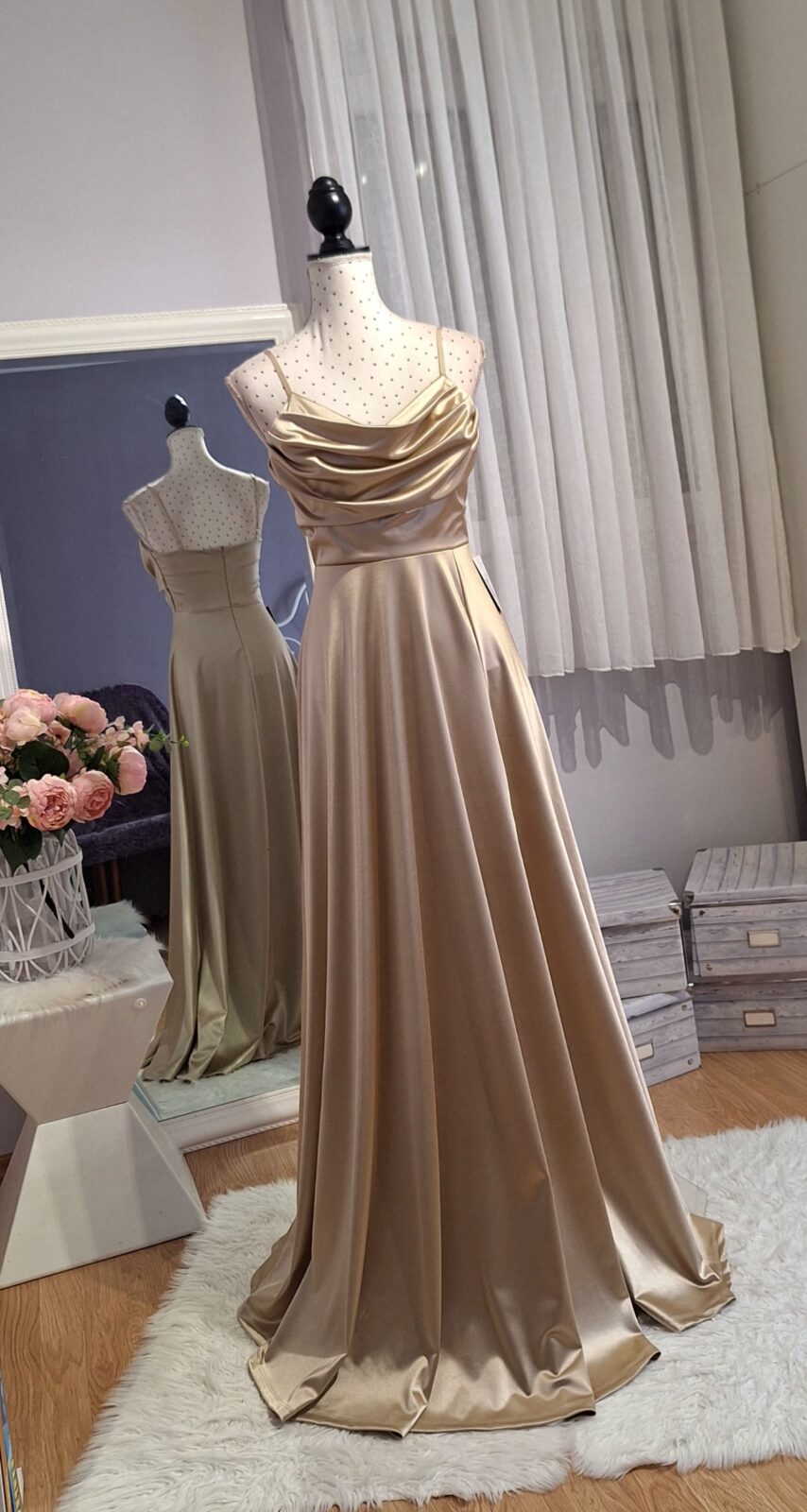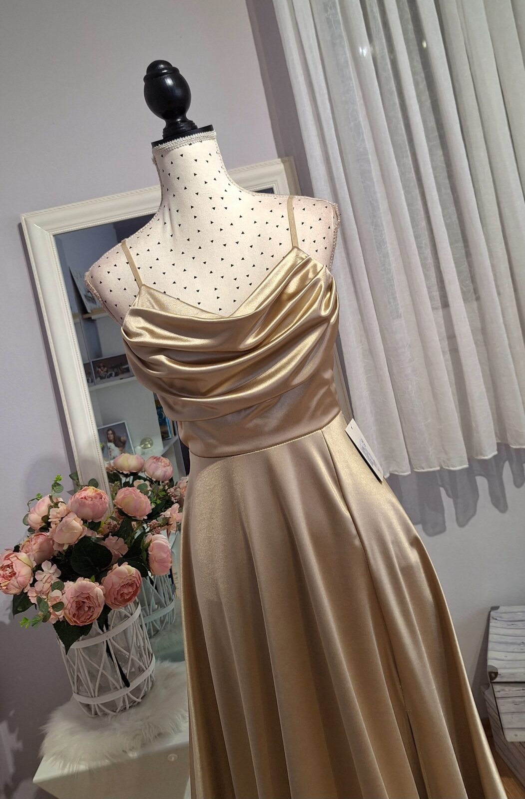 Haljina duga boje zlata s rasporkom, zatvarač na leđima, podesive naramenice,