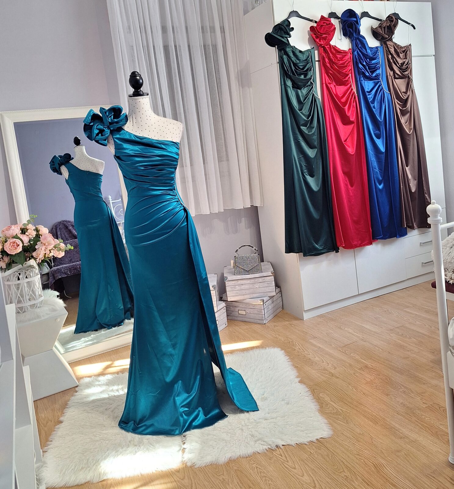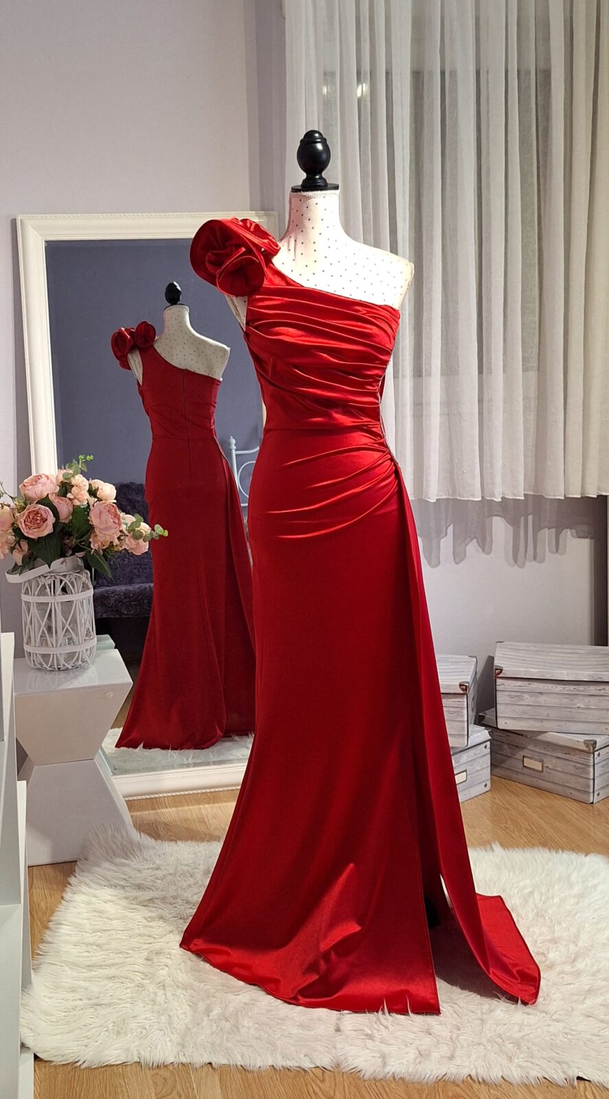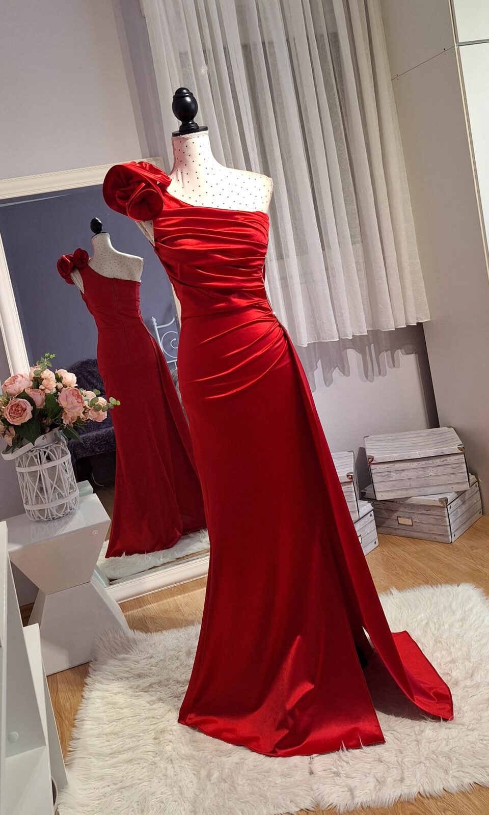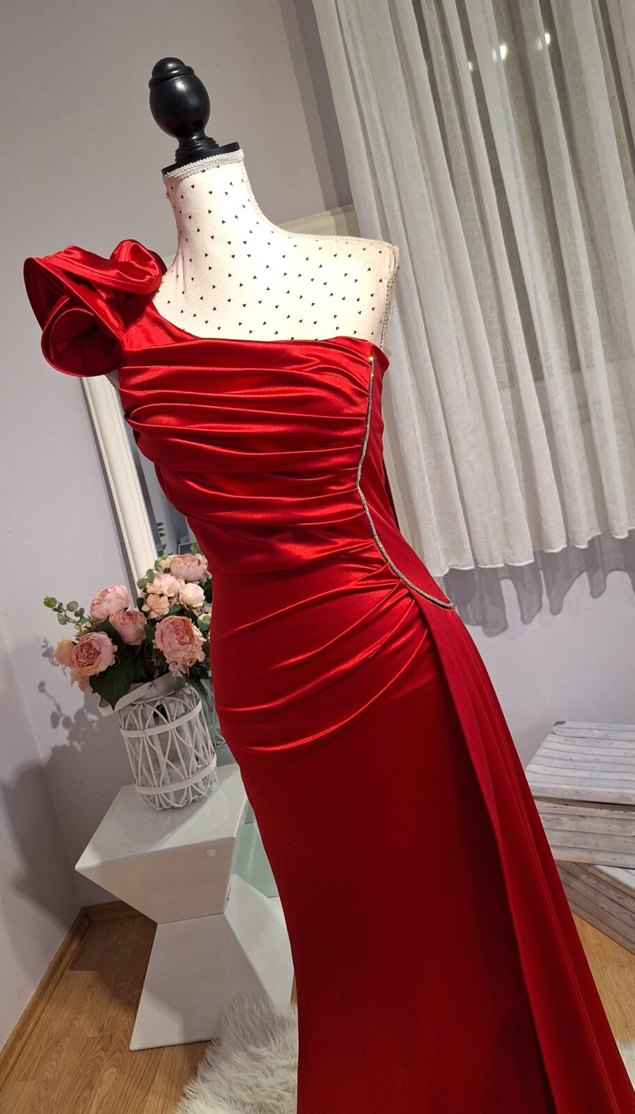 Haljina duga crvena sa cvijetom na ramenu i srebrnim ukrasima, rasporak, zatvarač na leđima, dio koji visi može poslužiti i kao šal,