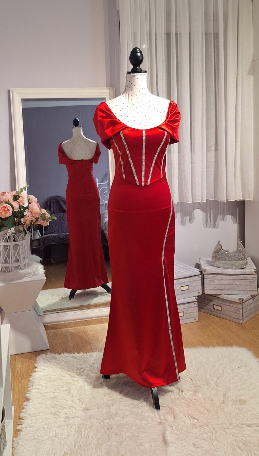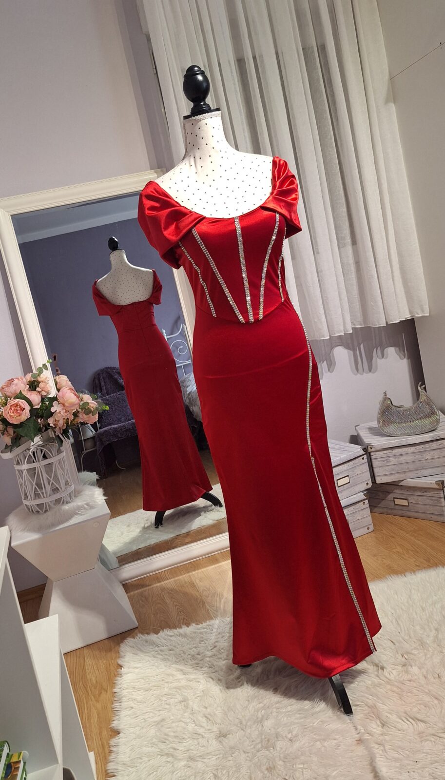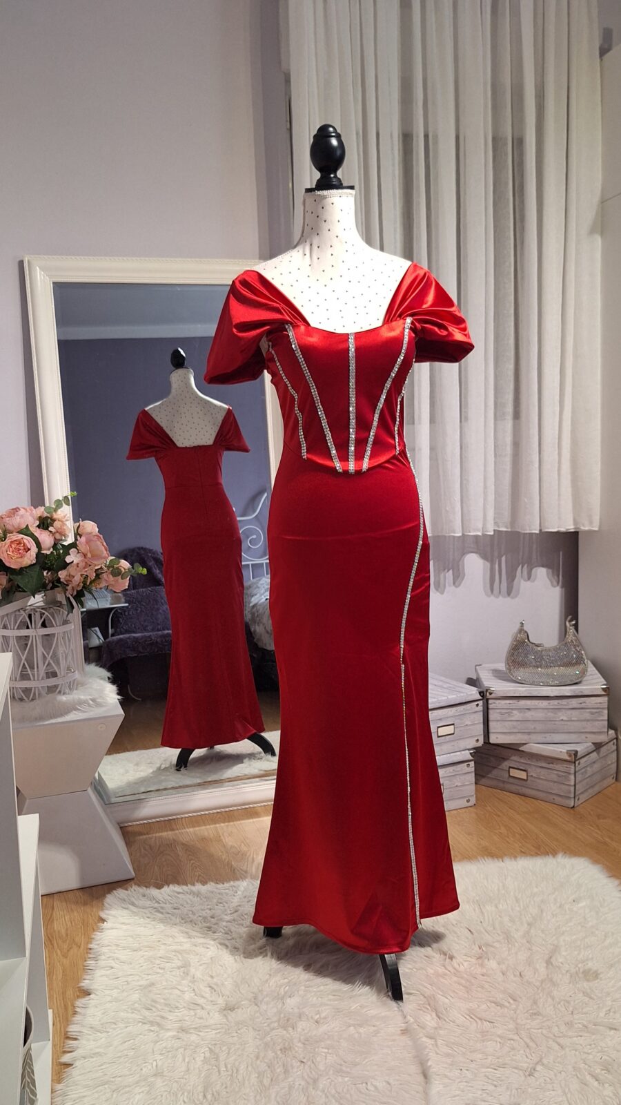 Haljina duga crvena na ramena s rasporkom i srebrnim ukrasima, zatvarač na leđima,