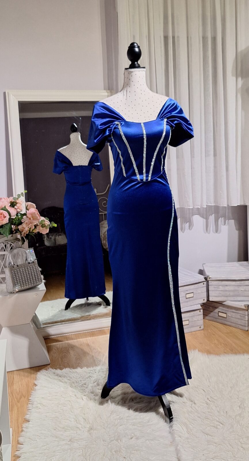 Haljina duga kraljevsko plava, spuštena ramena, s rasporkom i srebrnim ukrasima, zatvarač na leđima,