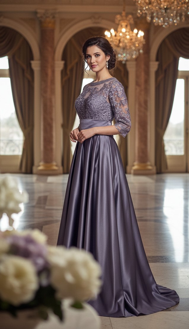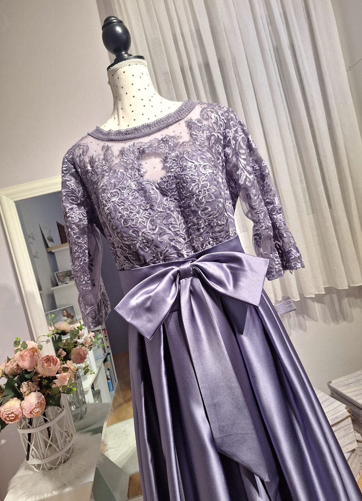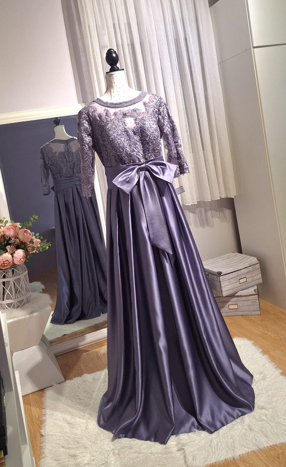 Haljina duga ljubičasta sa čipkom u gornjem dijelu, zatvarač na leđima, pojas sa mašnom koja se može zakopčiti,