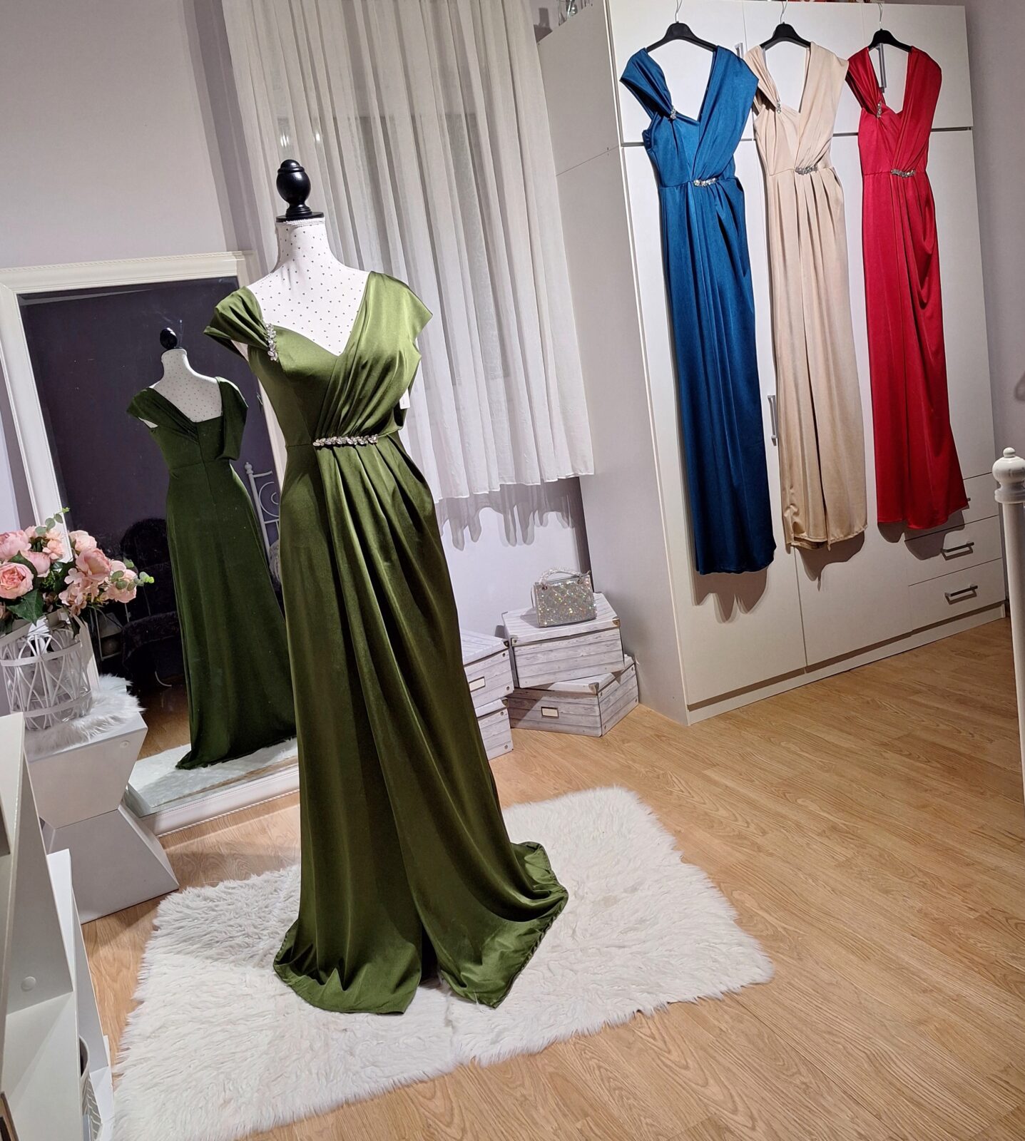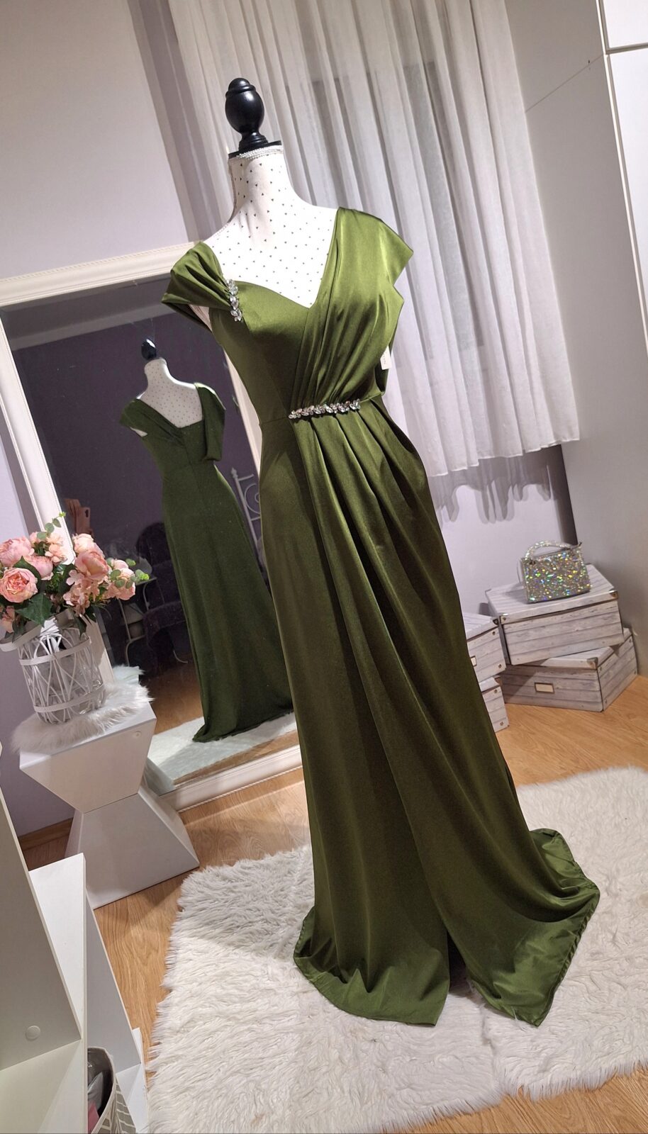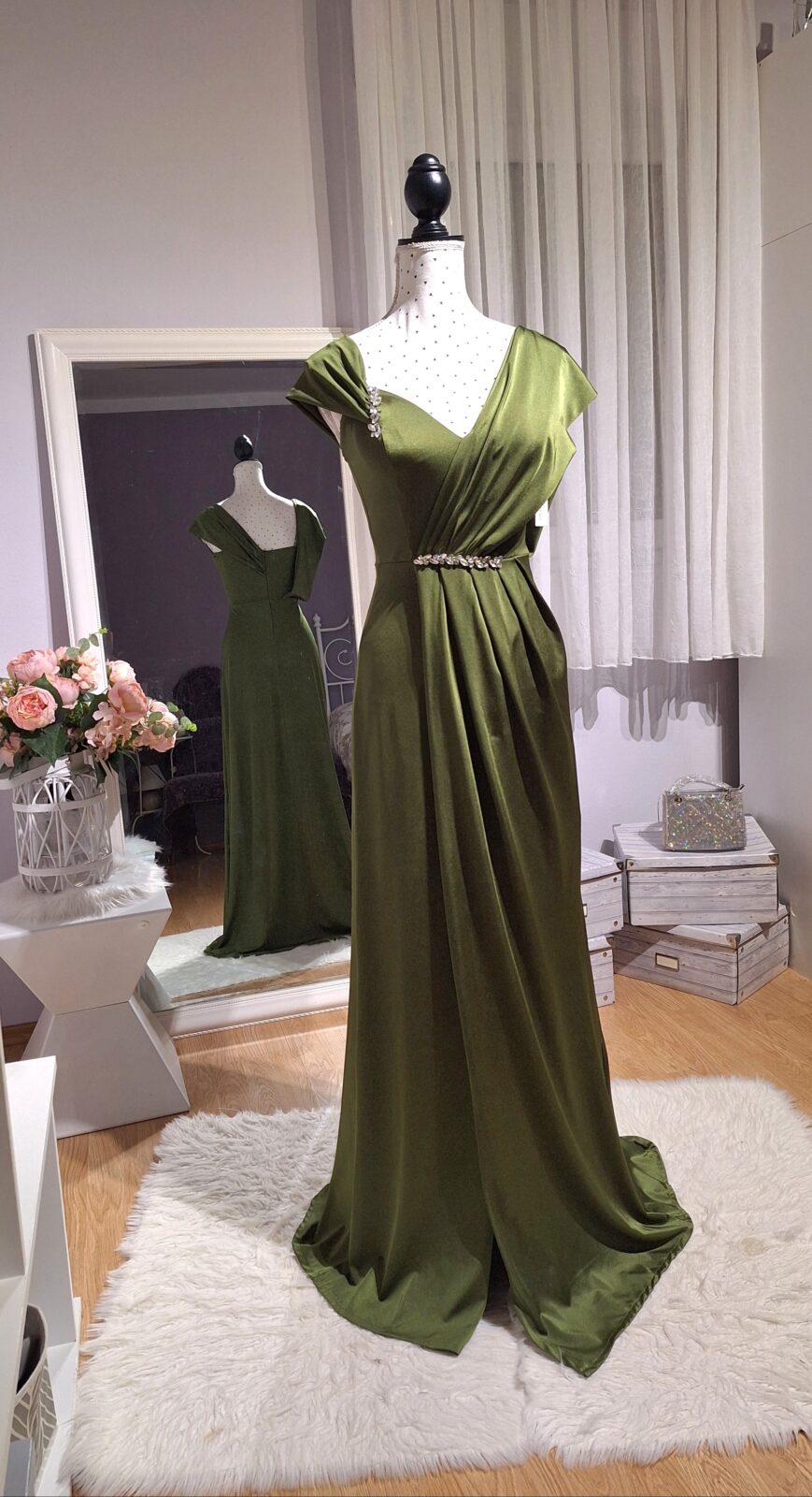Haljina duga maslinasta na jedno rame s rasporkom, srebrni cirkoni, zatvarač na leđima, podesive naramenice,