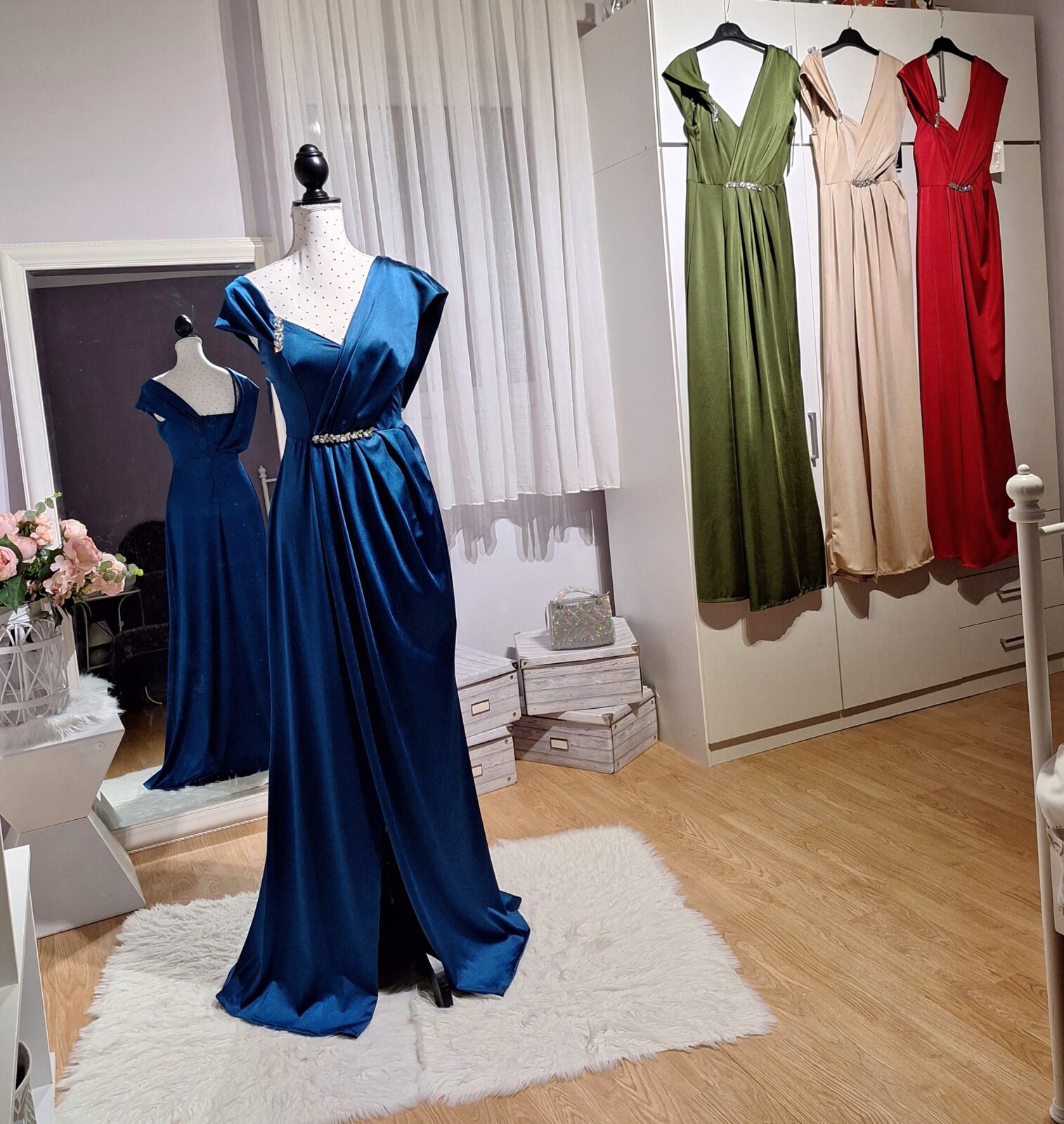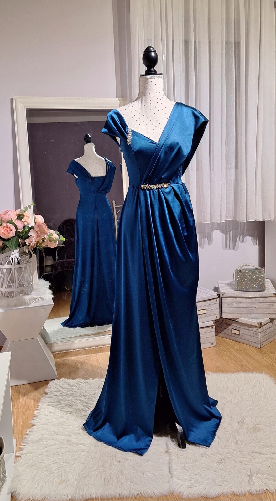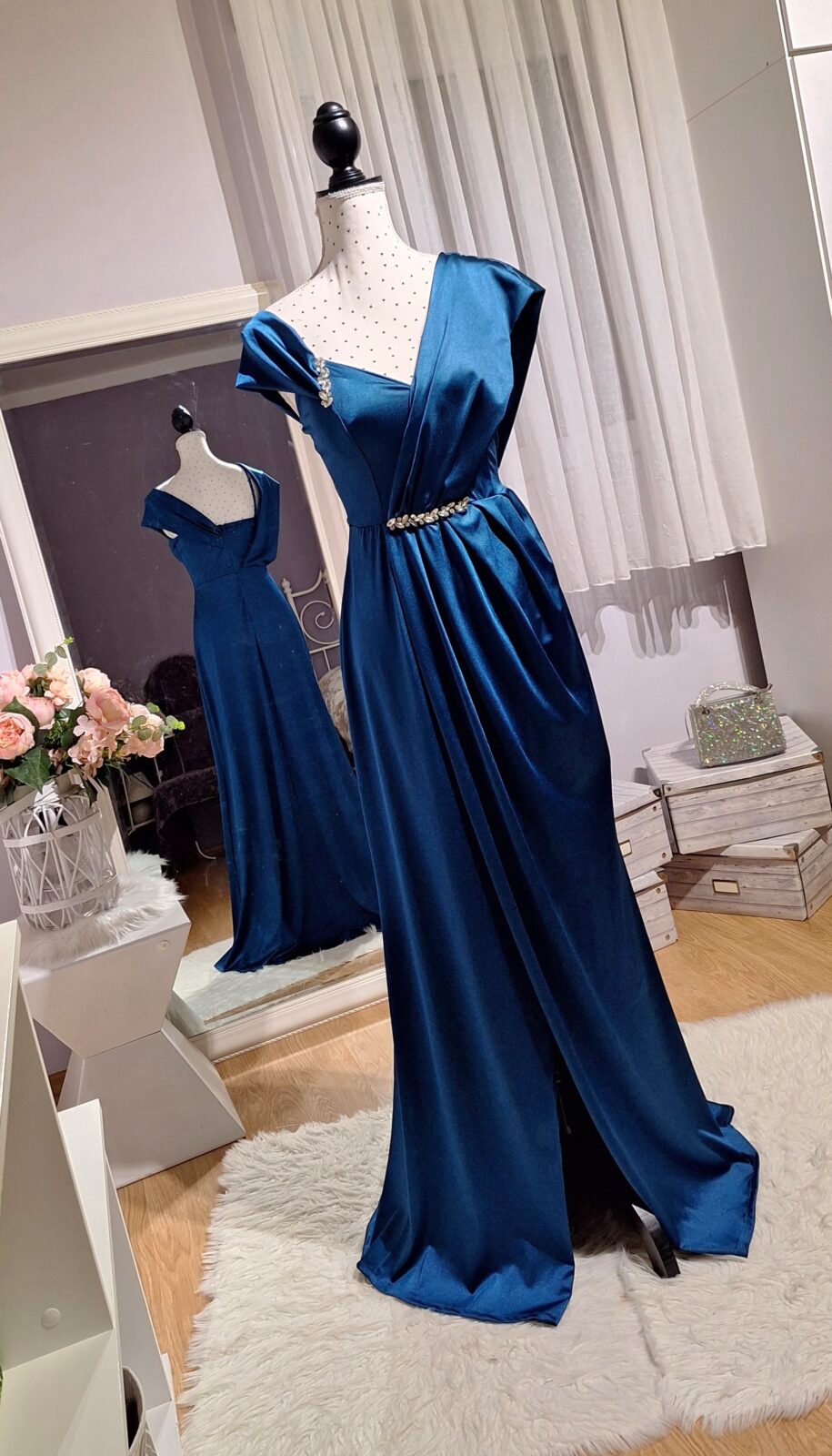 Haljina duga petrolej zelena na jedno rame s rasporkom, srebrni cirkoni, zatvarač na leđima, podesive naramenice,