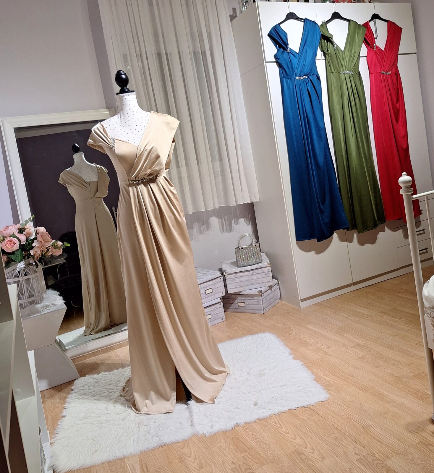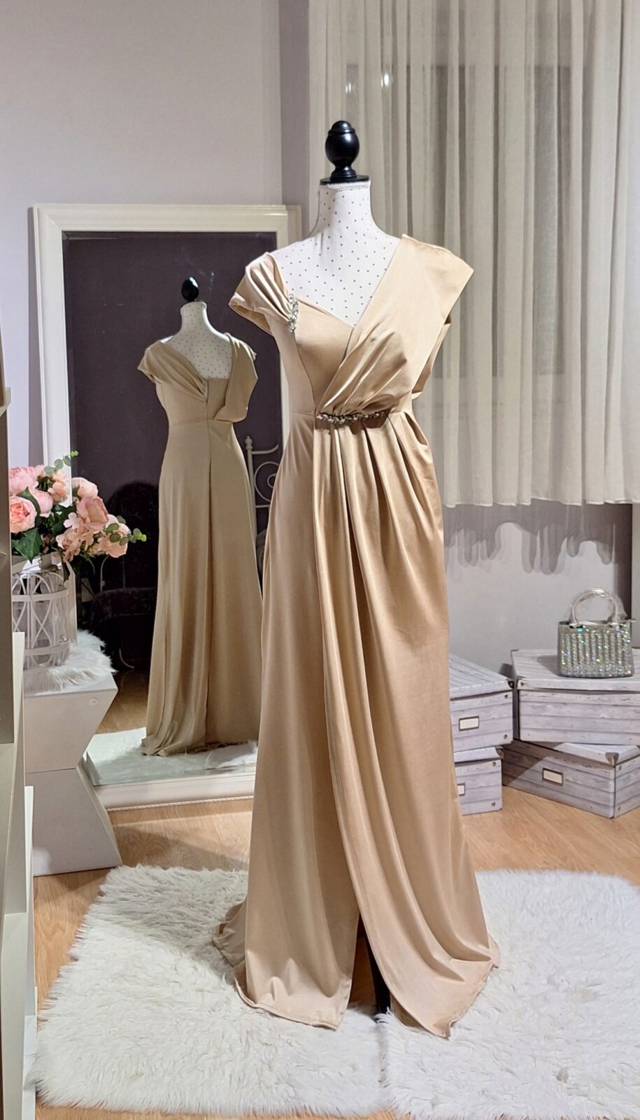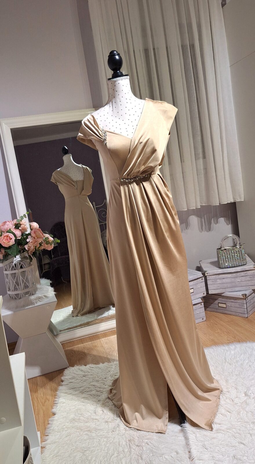Haljina duga boje zlata na jedno rame s rasporkom, srebrni cirkoni, zatvarač na leđima, podesive naramenice,