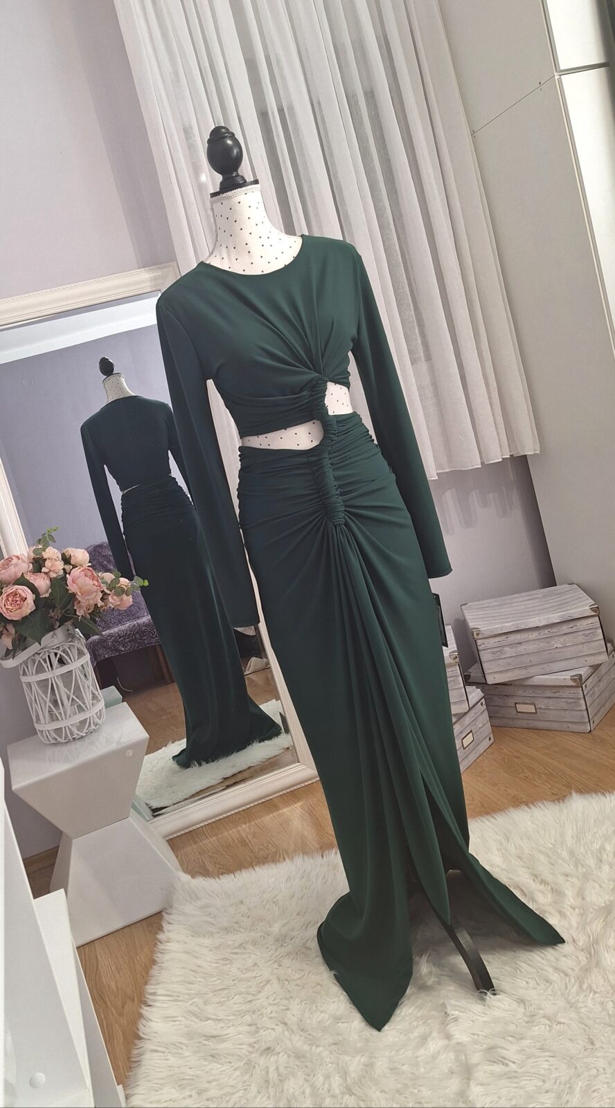 Haljina duga smaragdno zelena s visokim rasporkom naprijed, dugi rukavi,