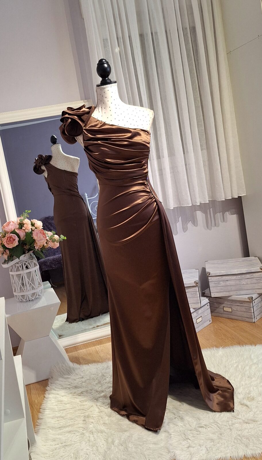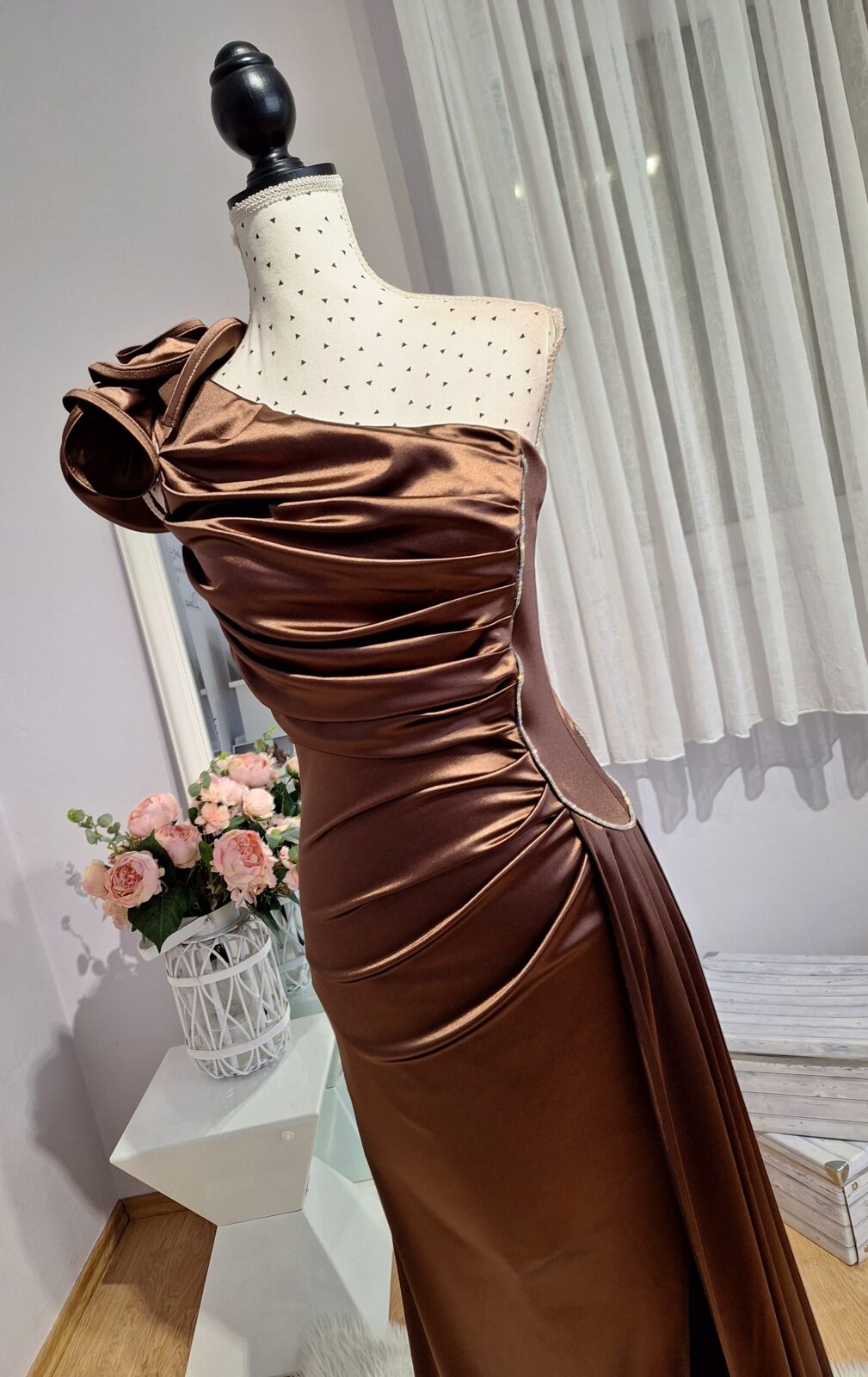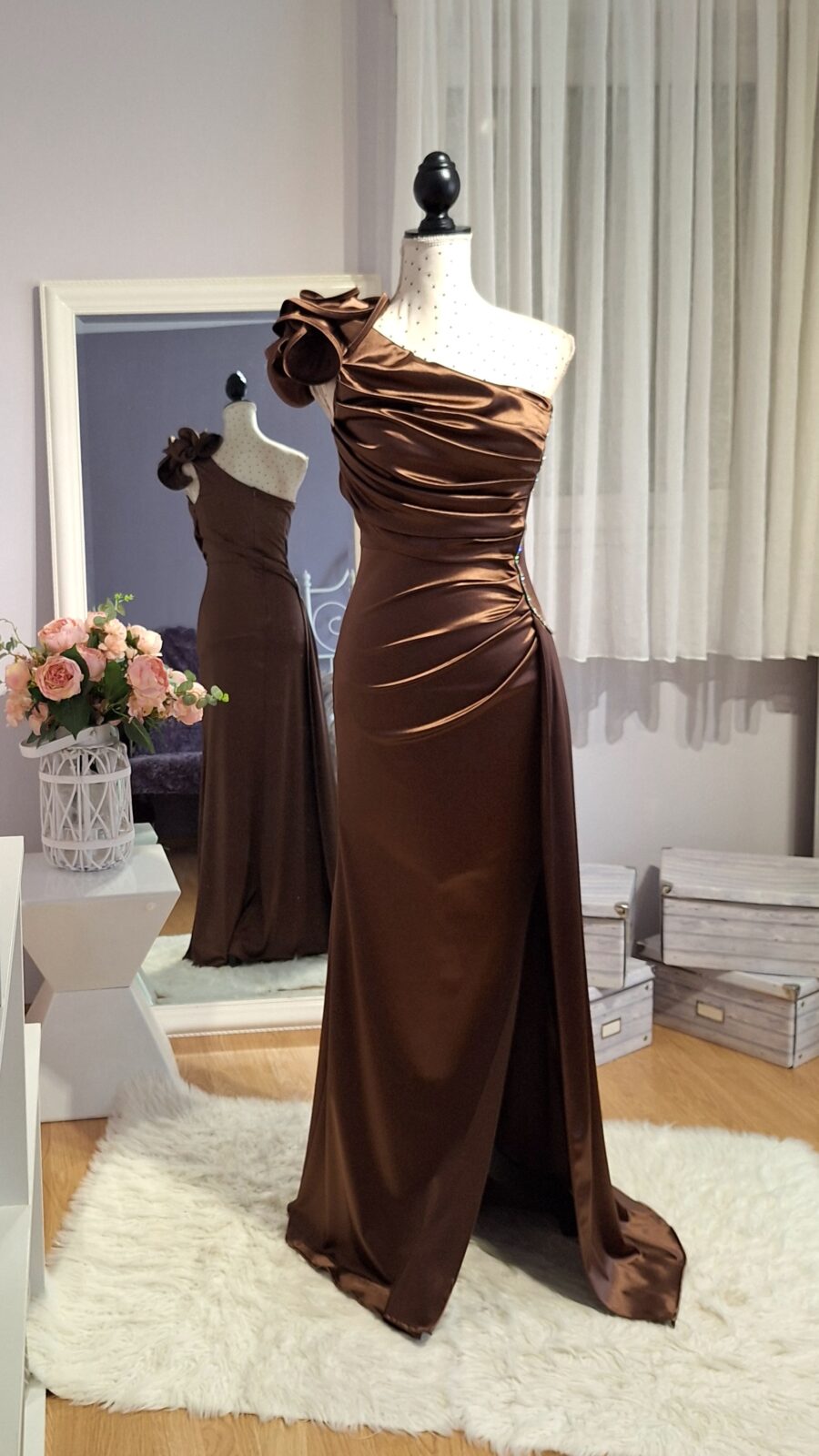 Haljina duga smeđe boje sa cvijetom na ramenu i srebrnim ukrasima, rasporak, zatvarač na leđima, dio koji visi može poslužiti i kao šal,
