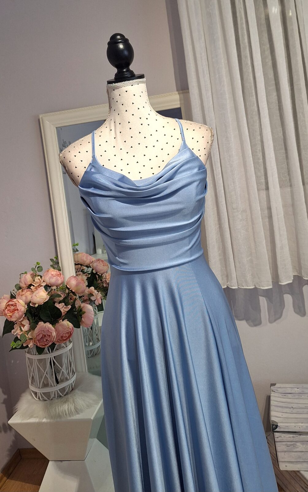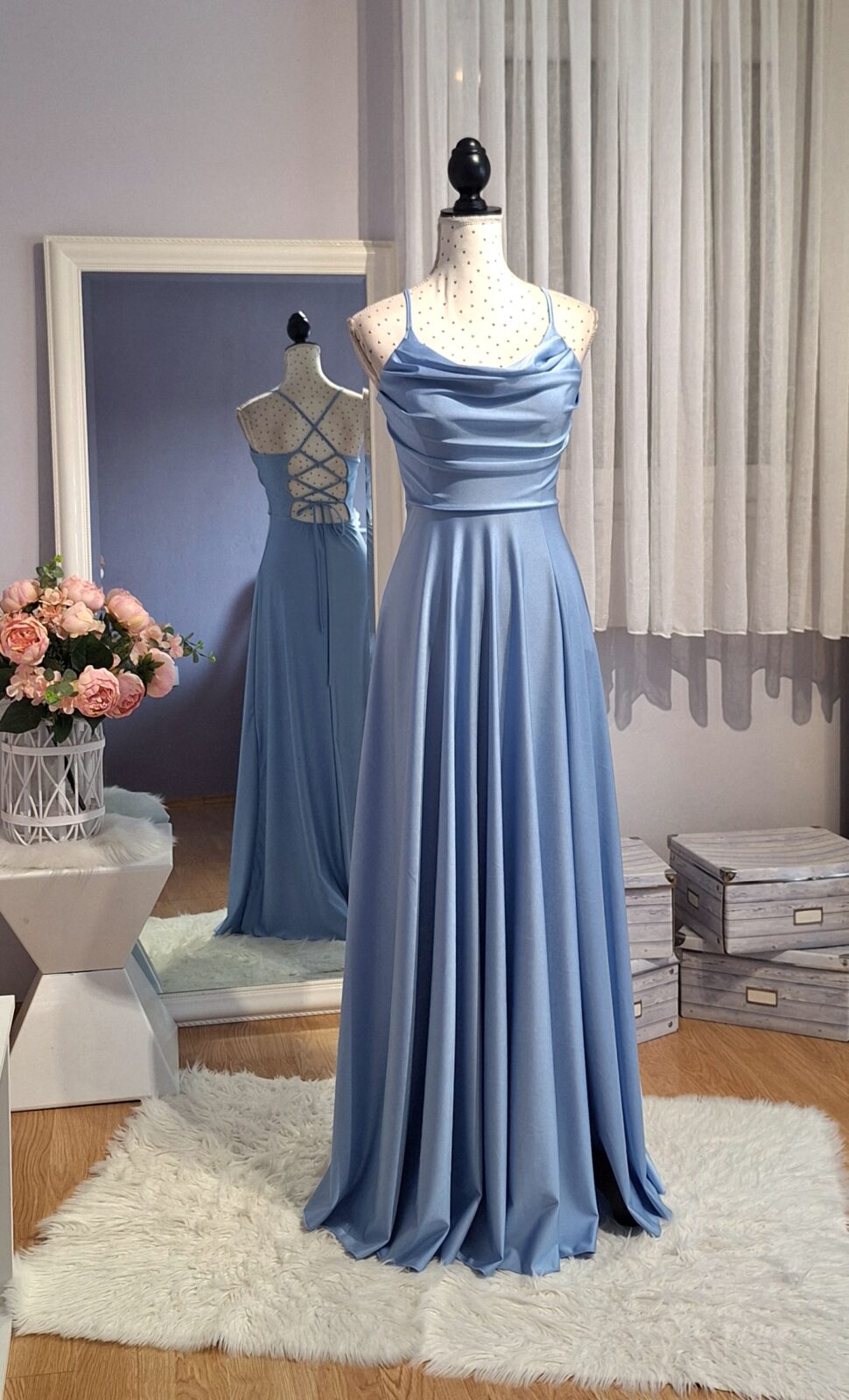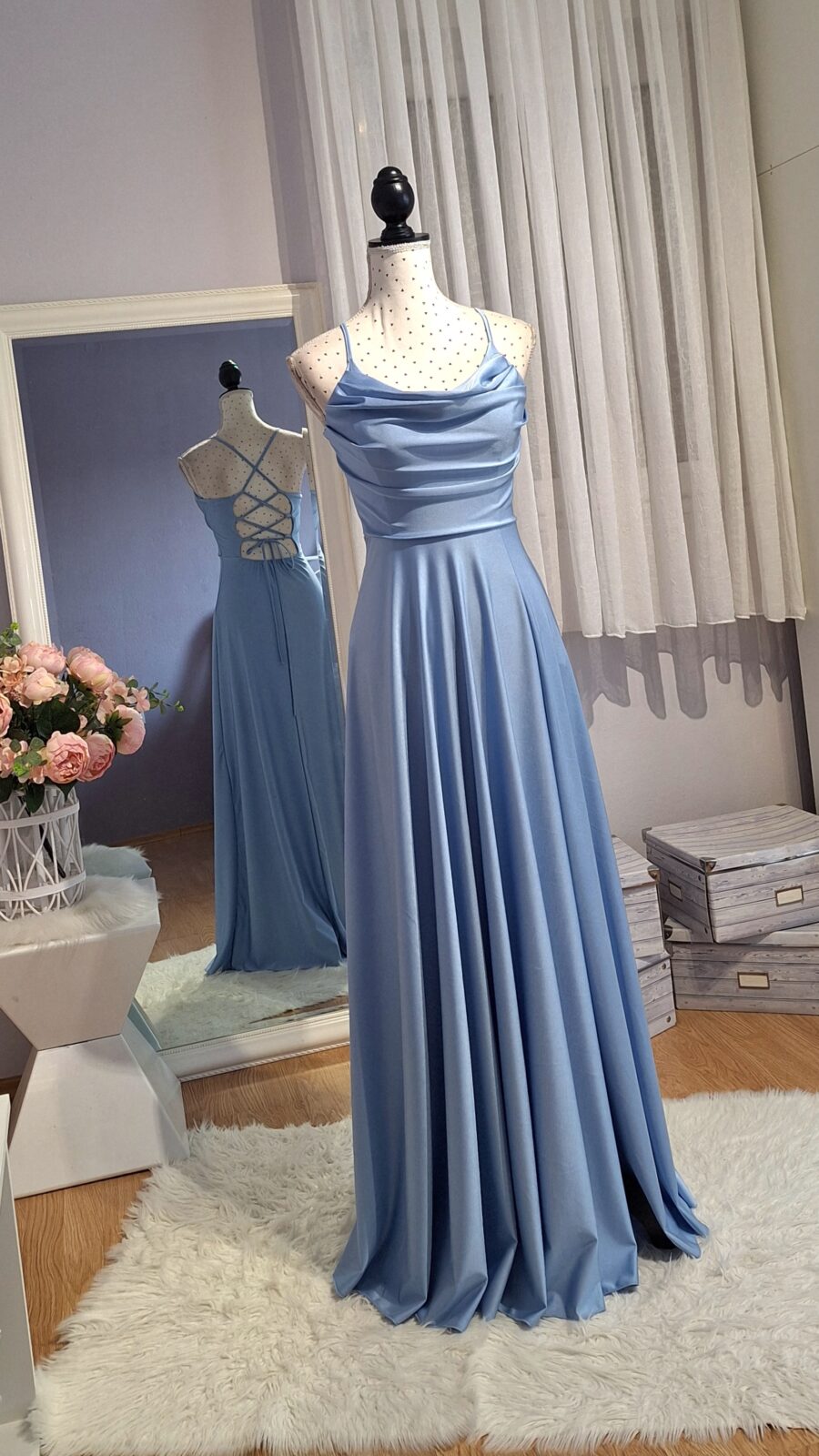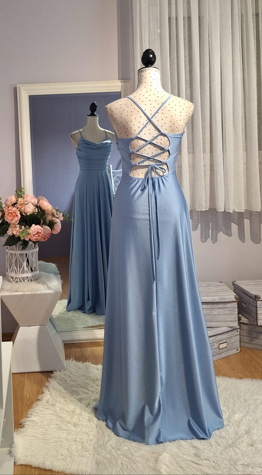 Haljina duga svijetlo plava sa rasporkom, vezanje na leđima