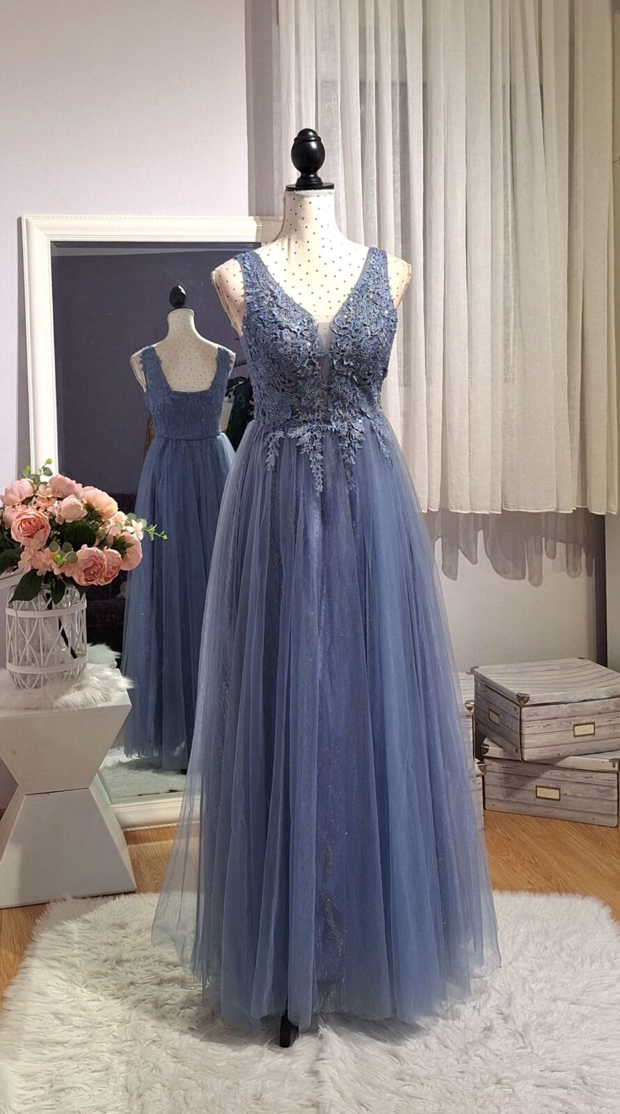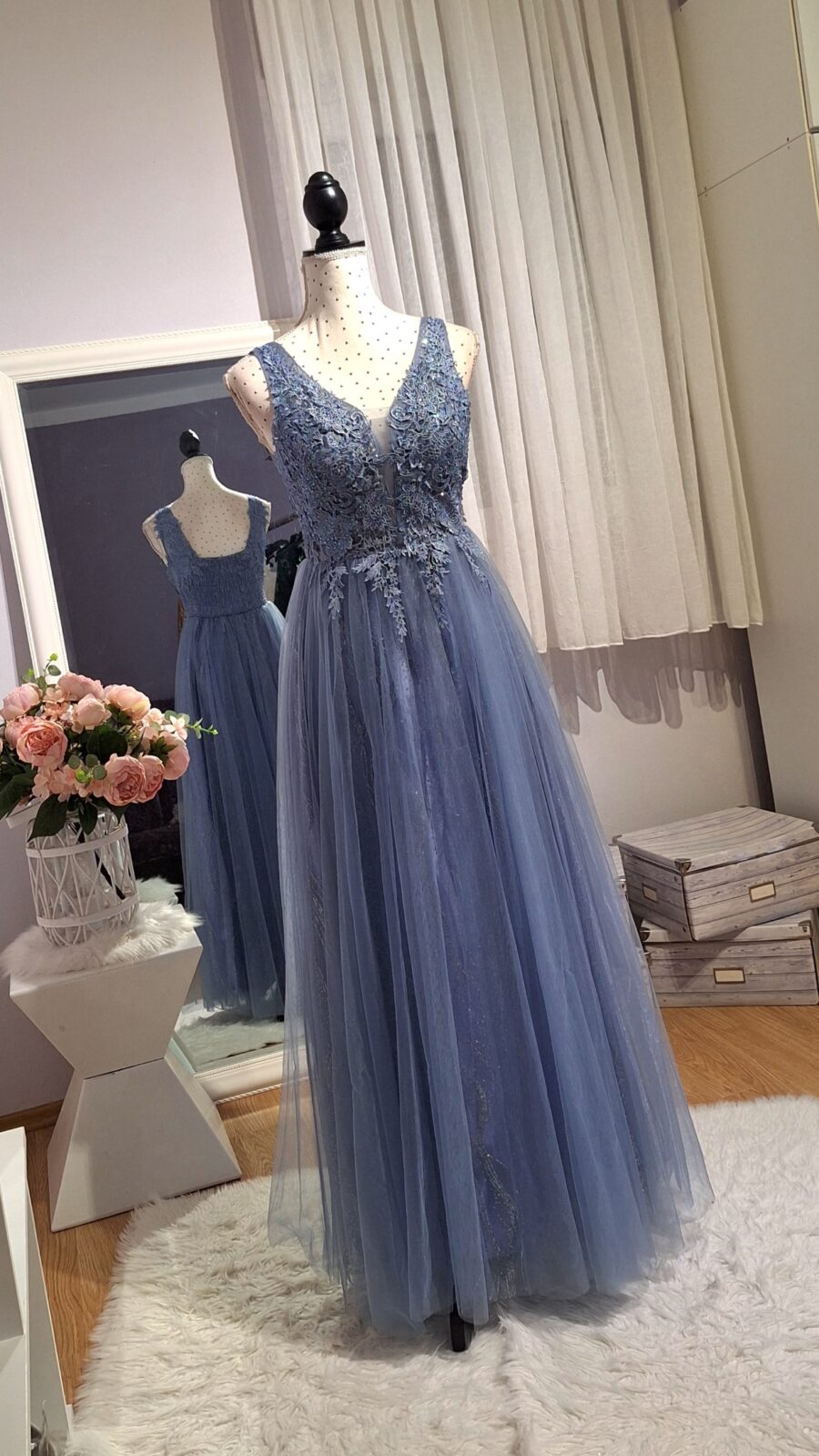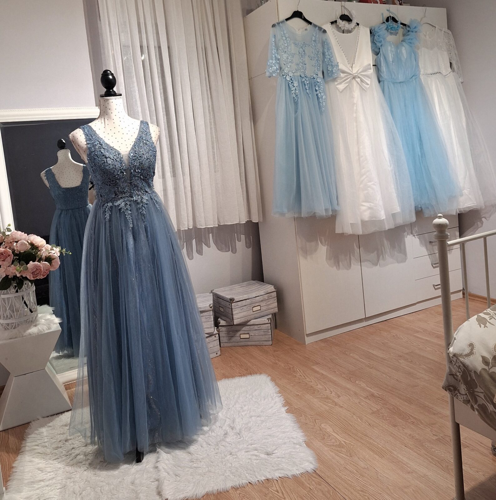 Haljina duga svijetlo plava sa šljokicama, gumica na leđima, bogata tilom