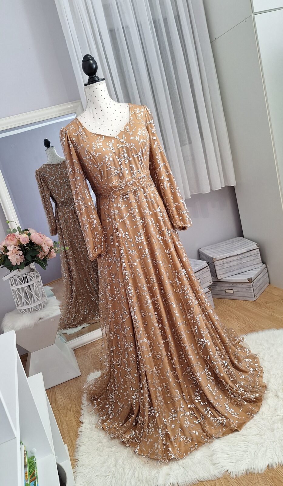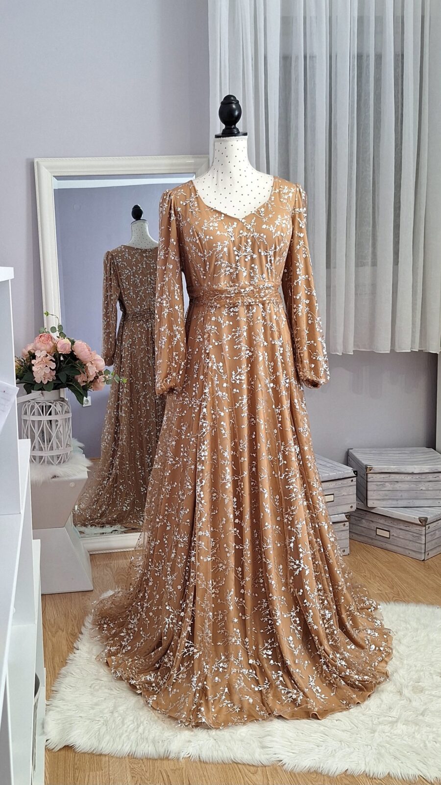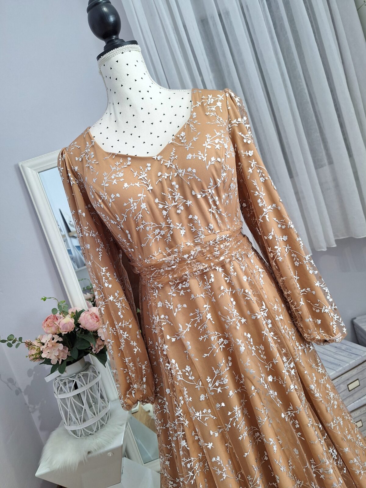 Haljina duga svijetlo smeđa sa srebrnim uzorkom, zatvarač na leđima,