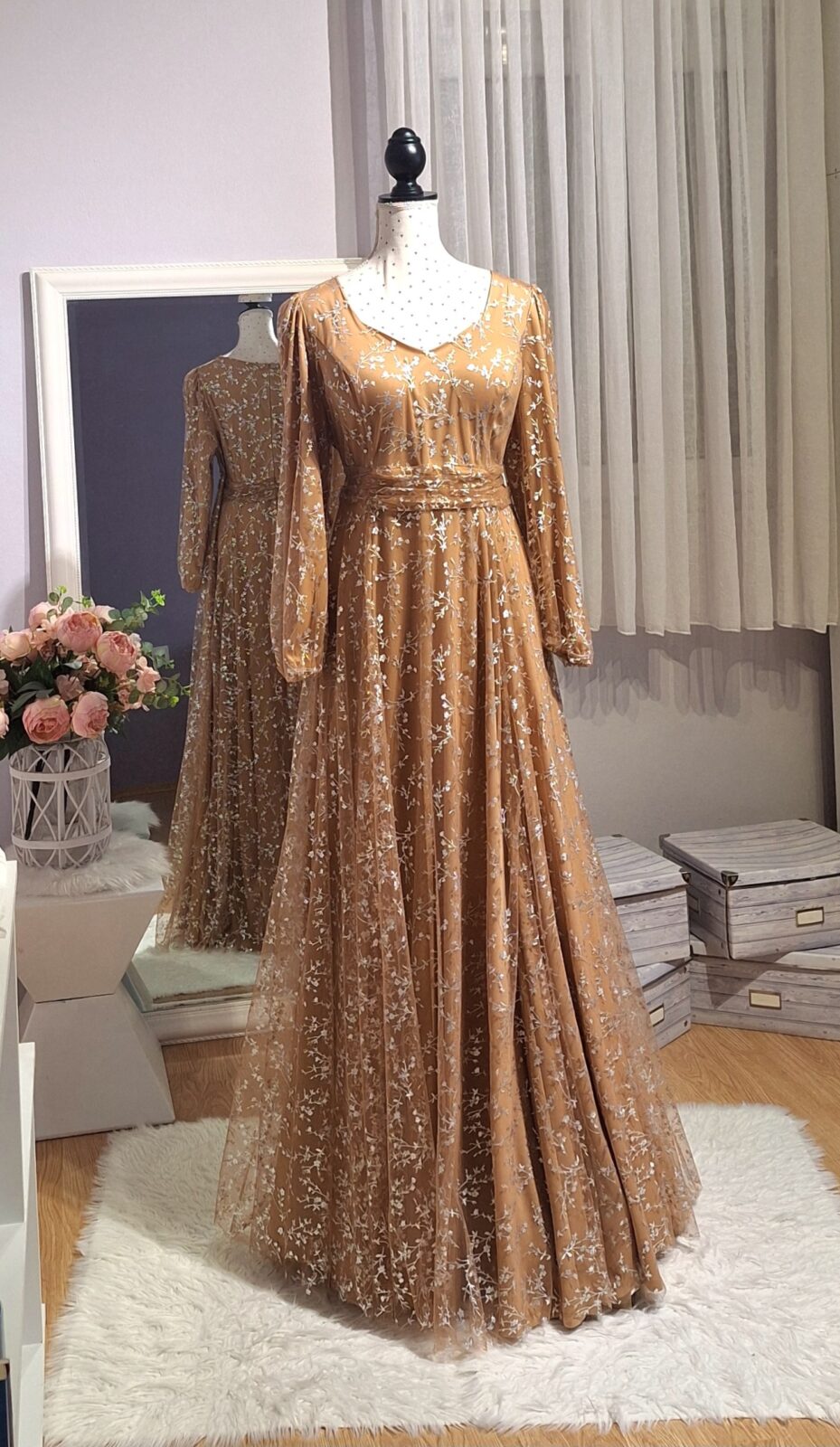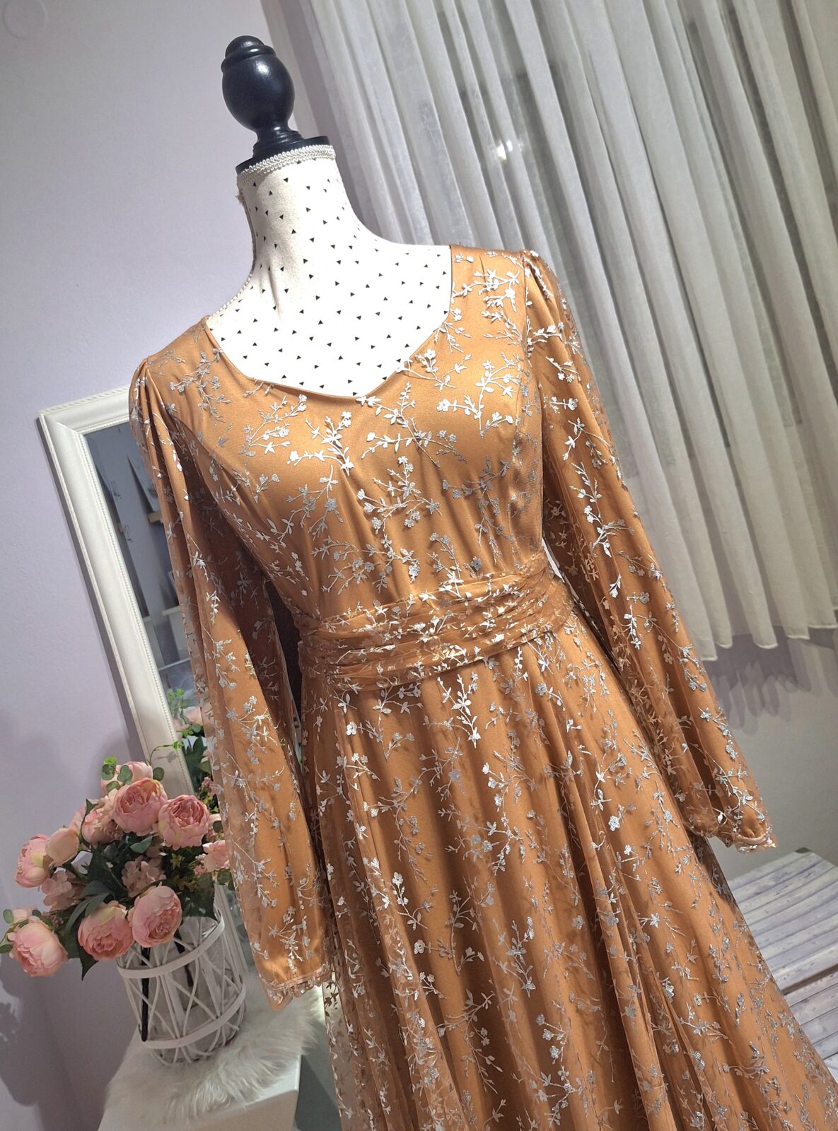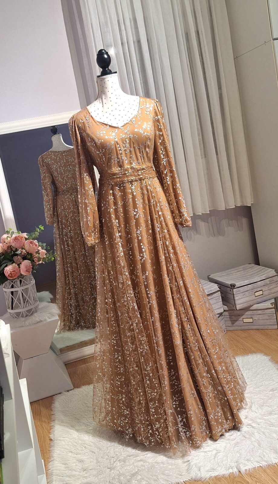 Haljina duga svijetlo smeđa sa srebrnim uzorkom