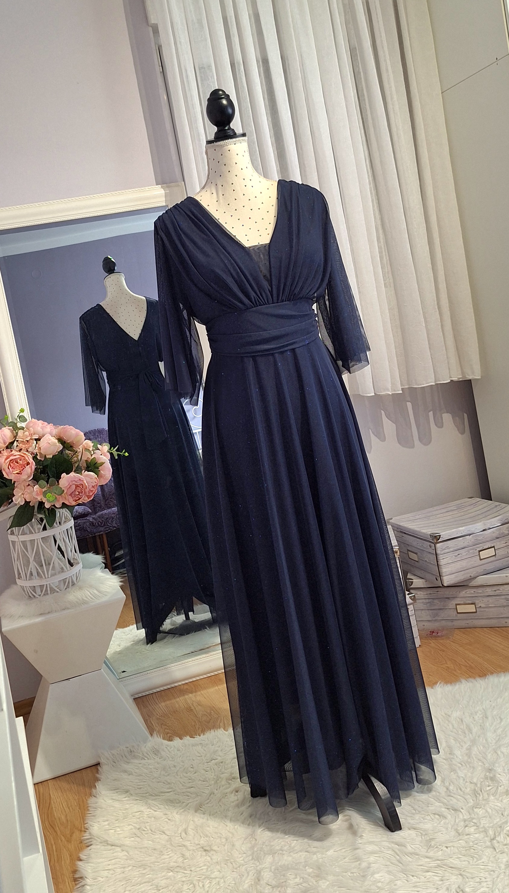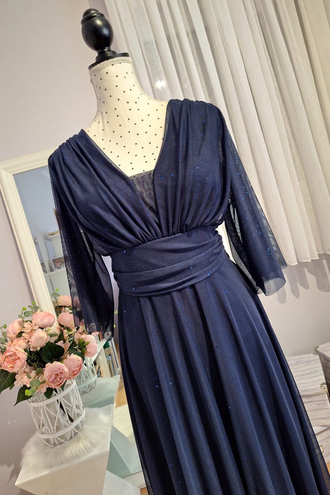 haljina duga tamno plava od tila sa šljokicama, 3/4 rukavi od tila