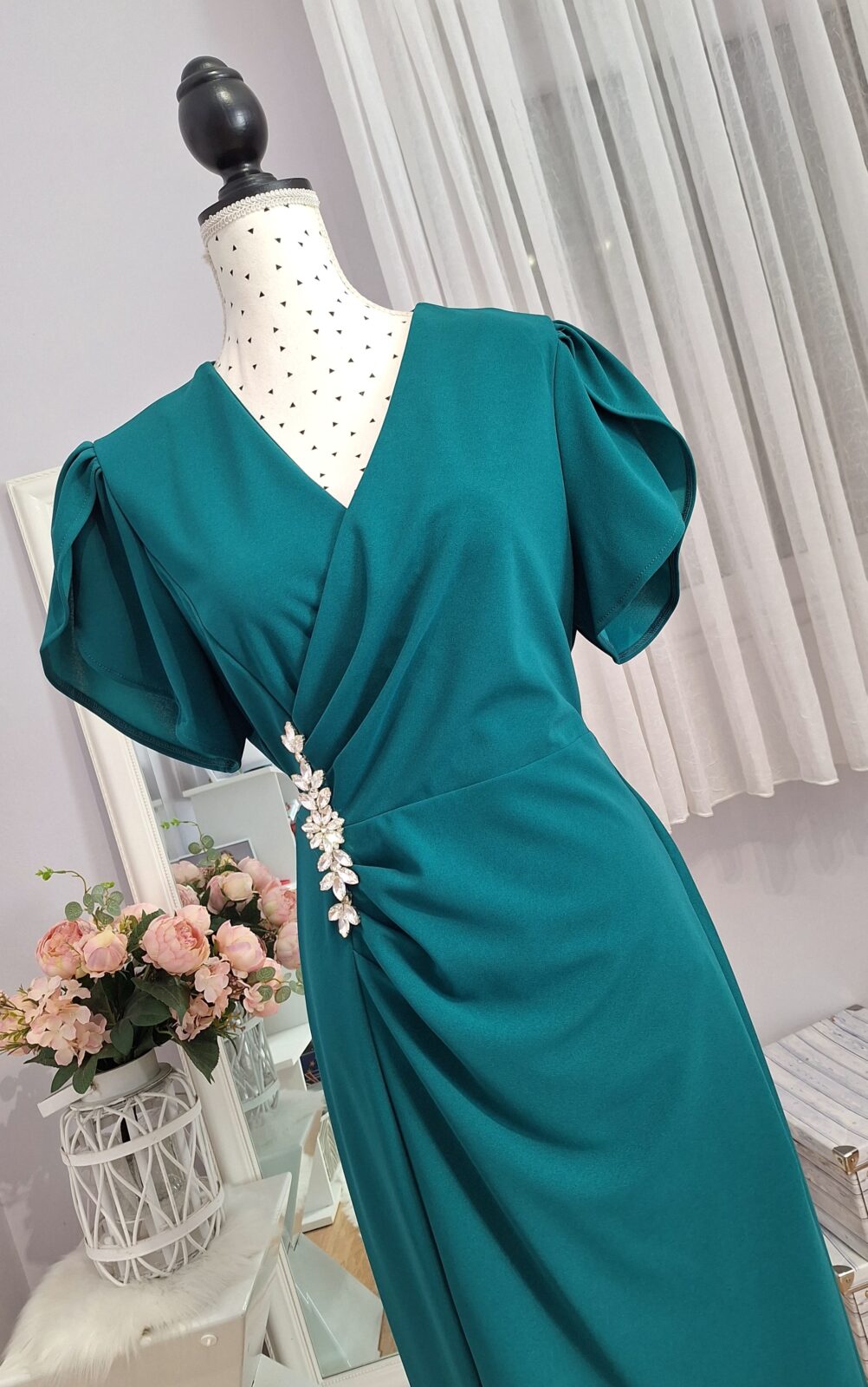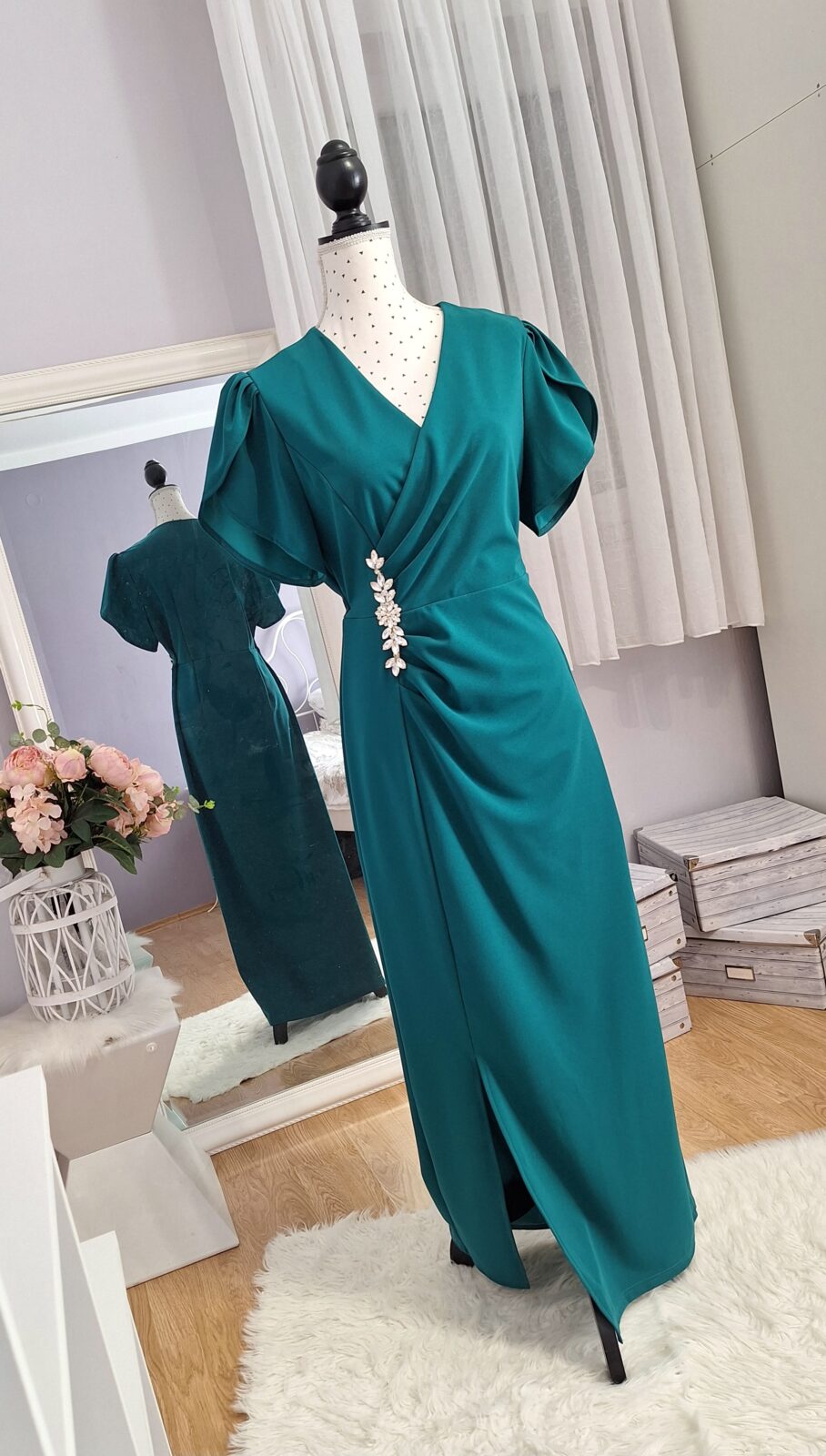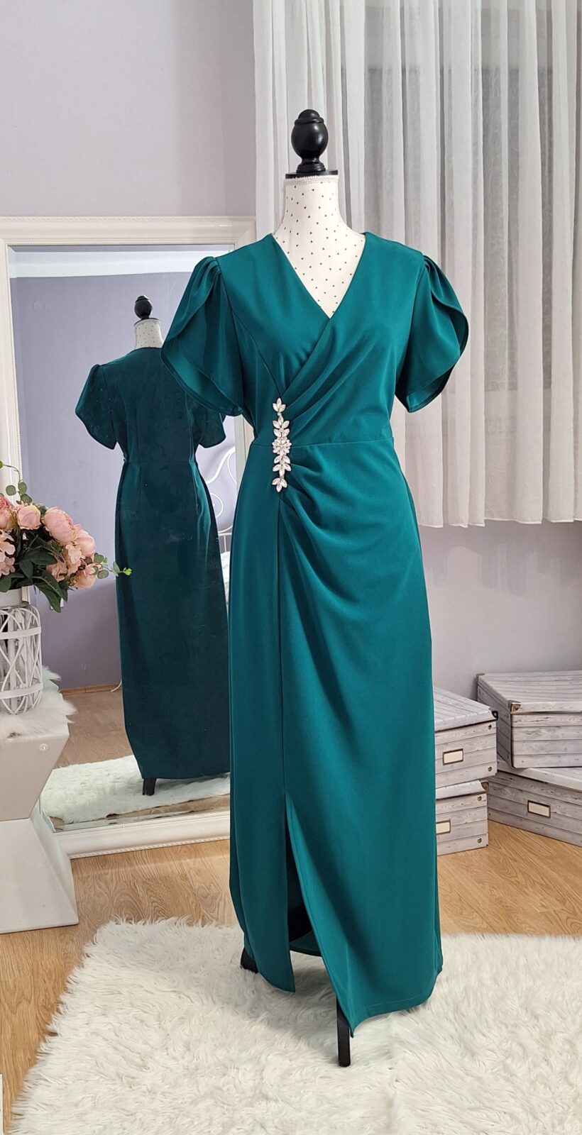 Haljina duga, uska, rastezljiva smaragdno zelena sa srebrnim ukrasima sa strane, zatvarač sa strane,