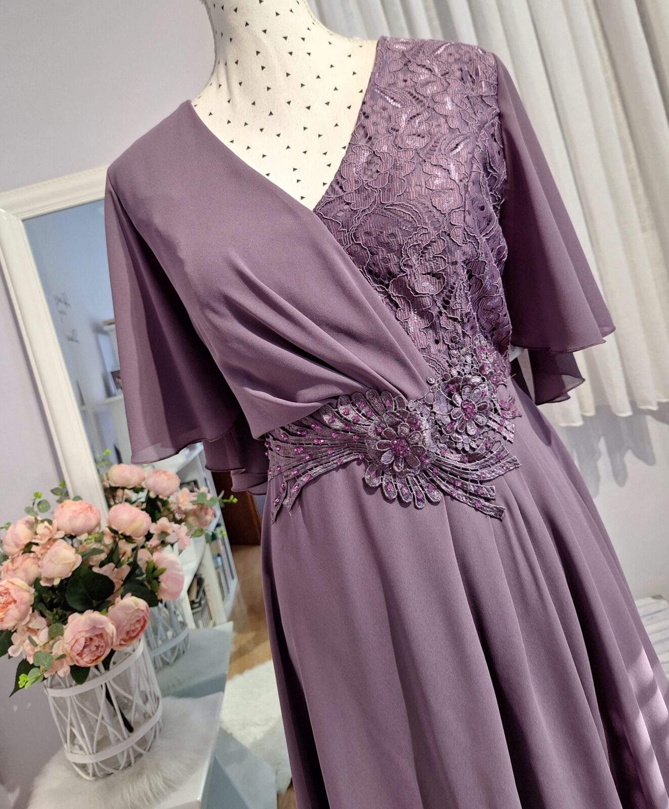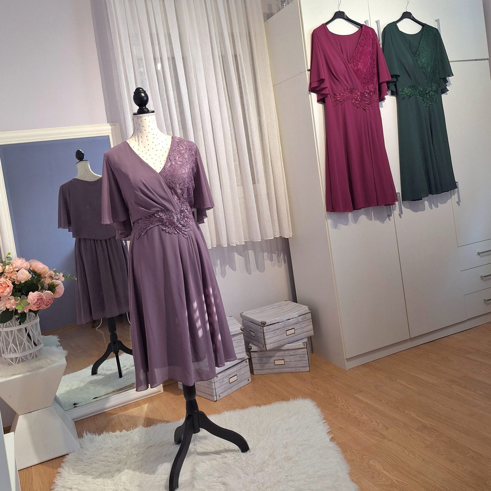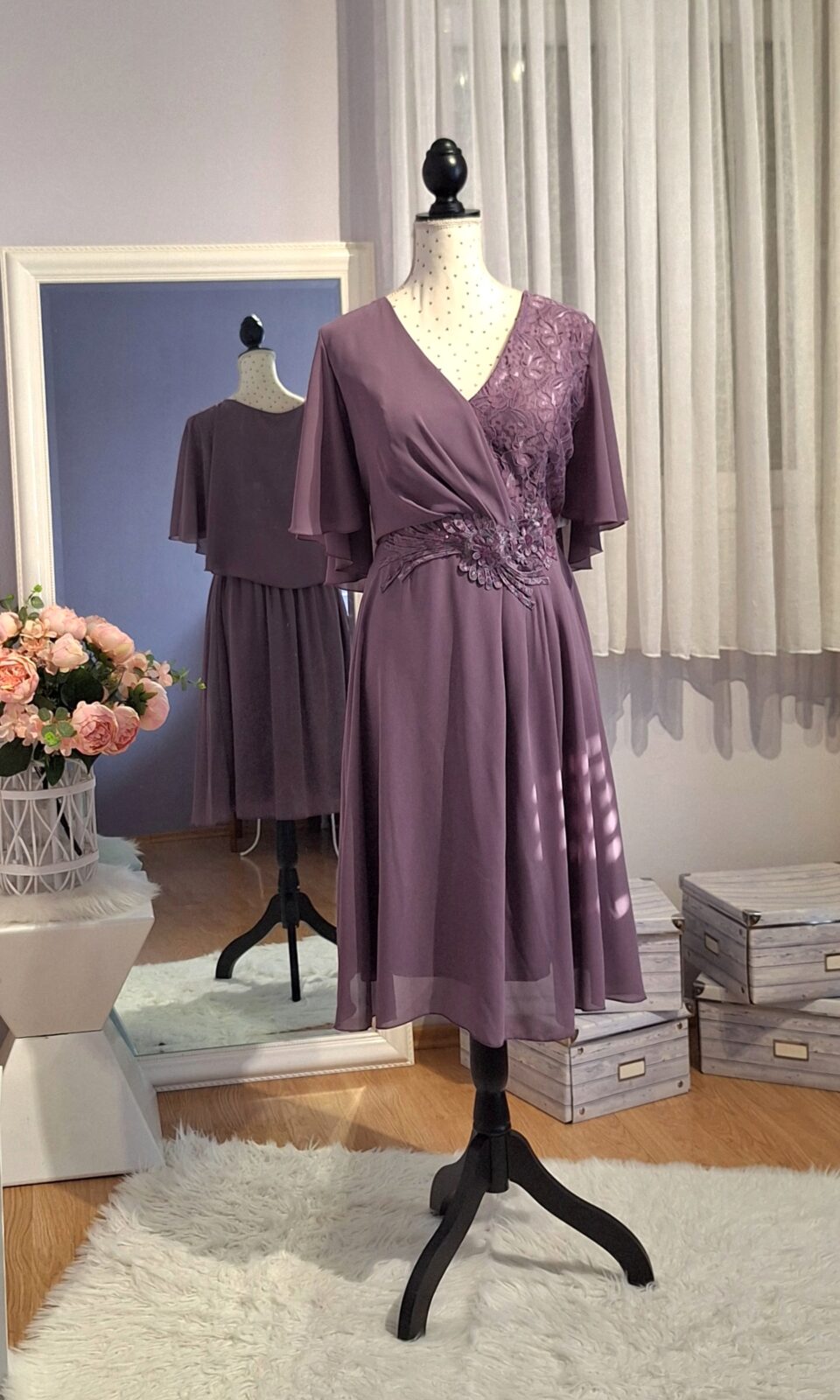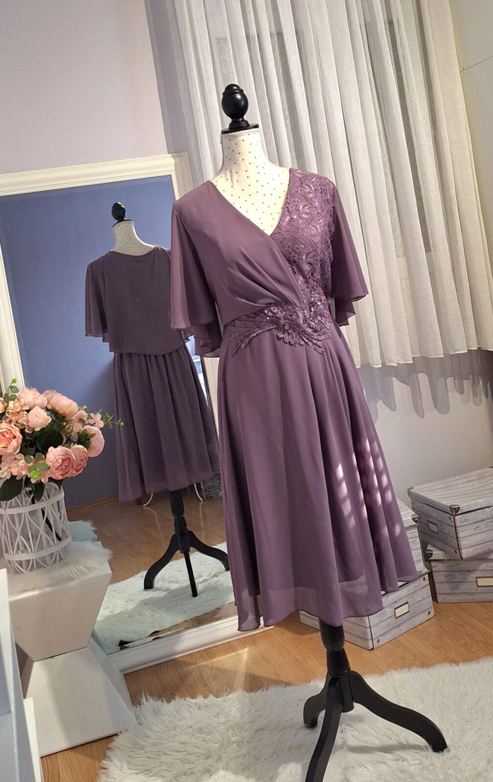 Haljina kratka boje lavande sa čipkom, gumica na leđima