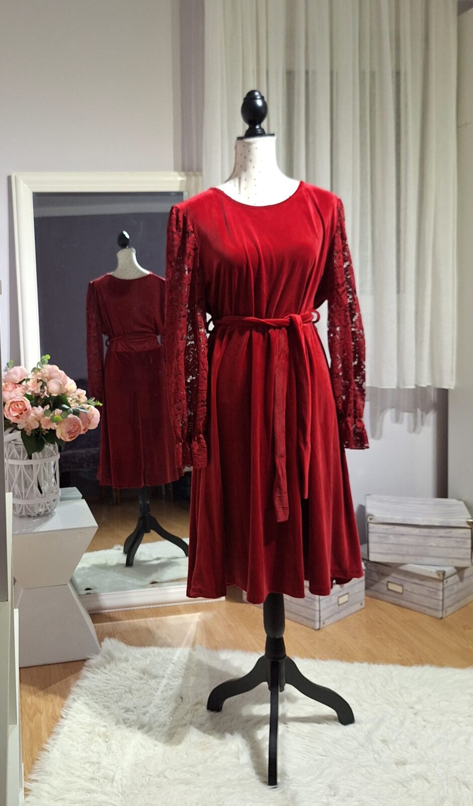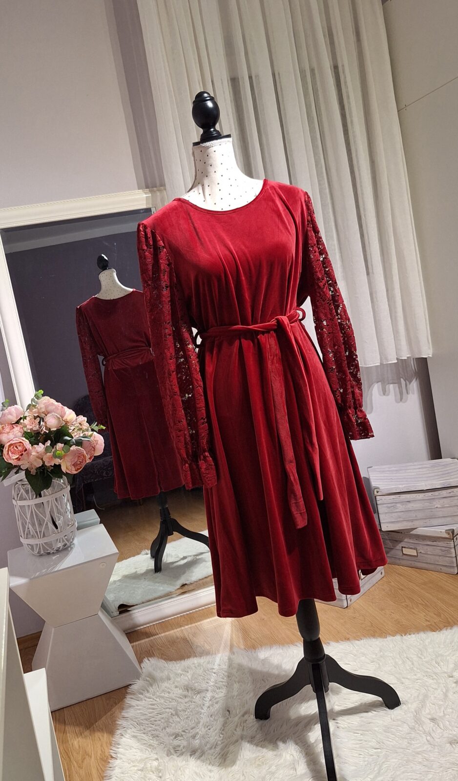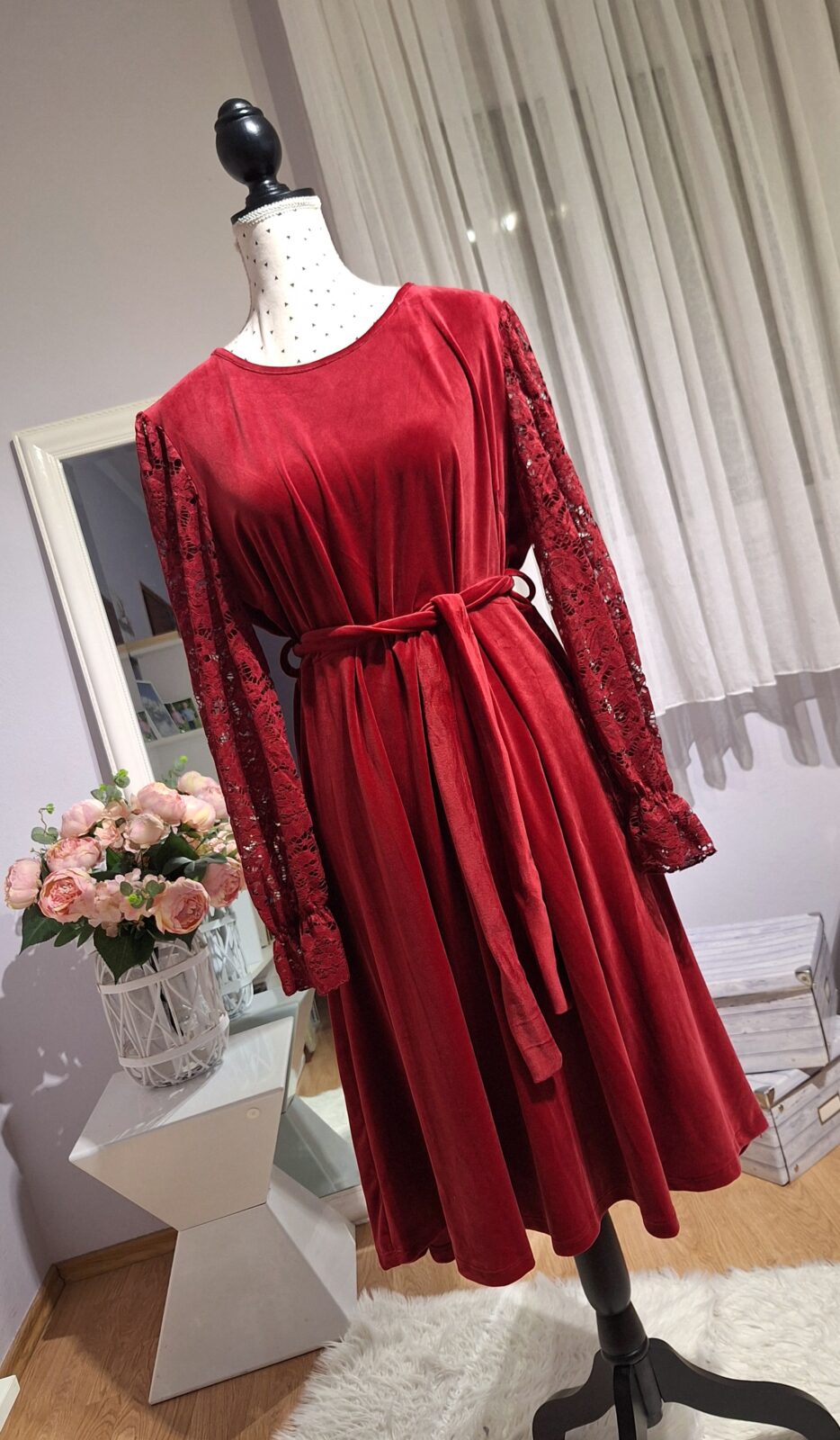 Haljina kratka bordo boje od pliša sa dugim rukavima od čipke, gumica u struku, plišani remen,