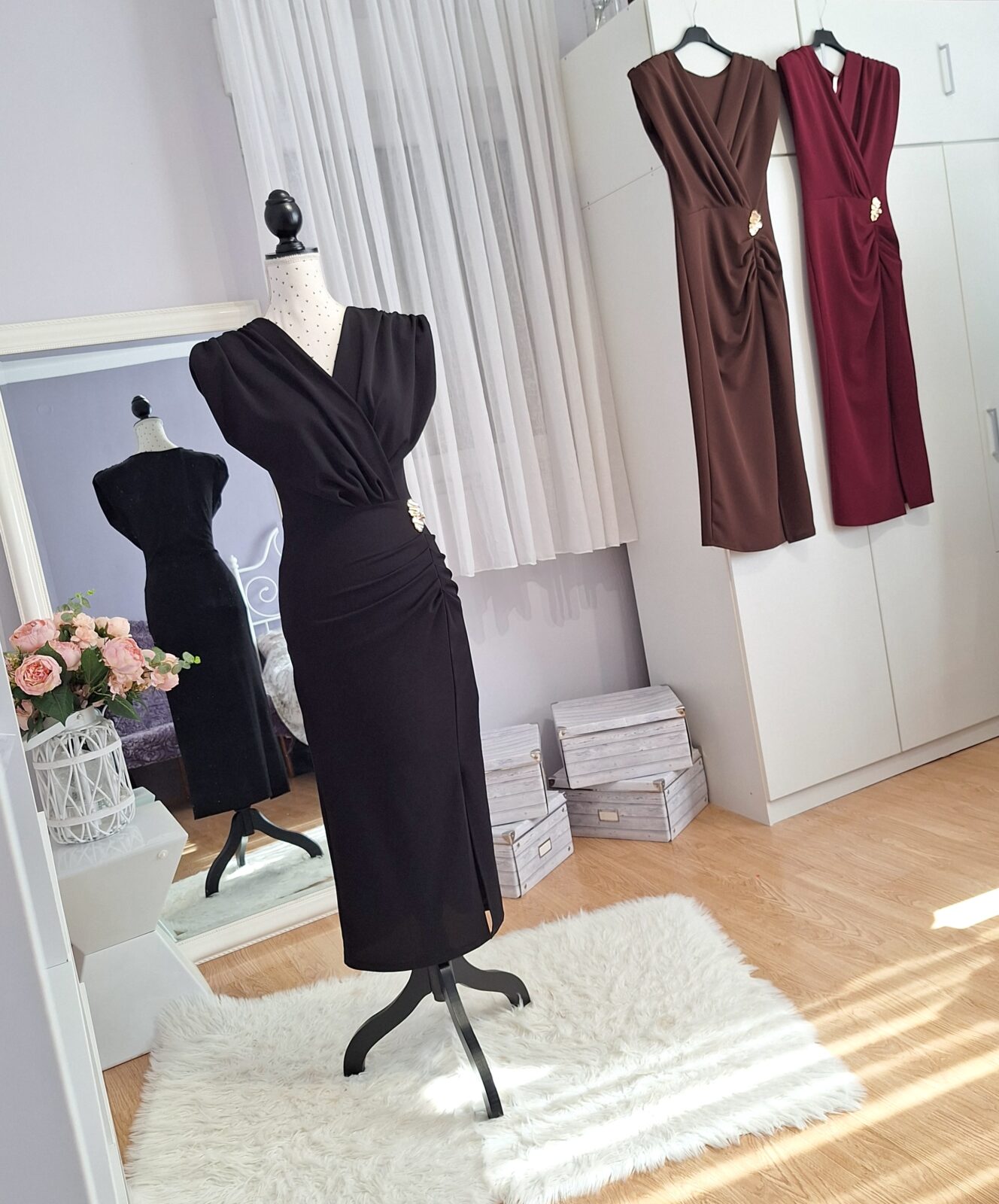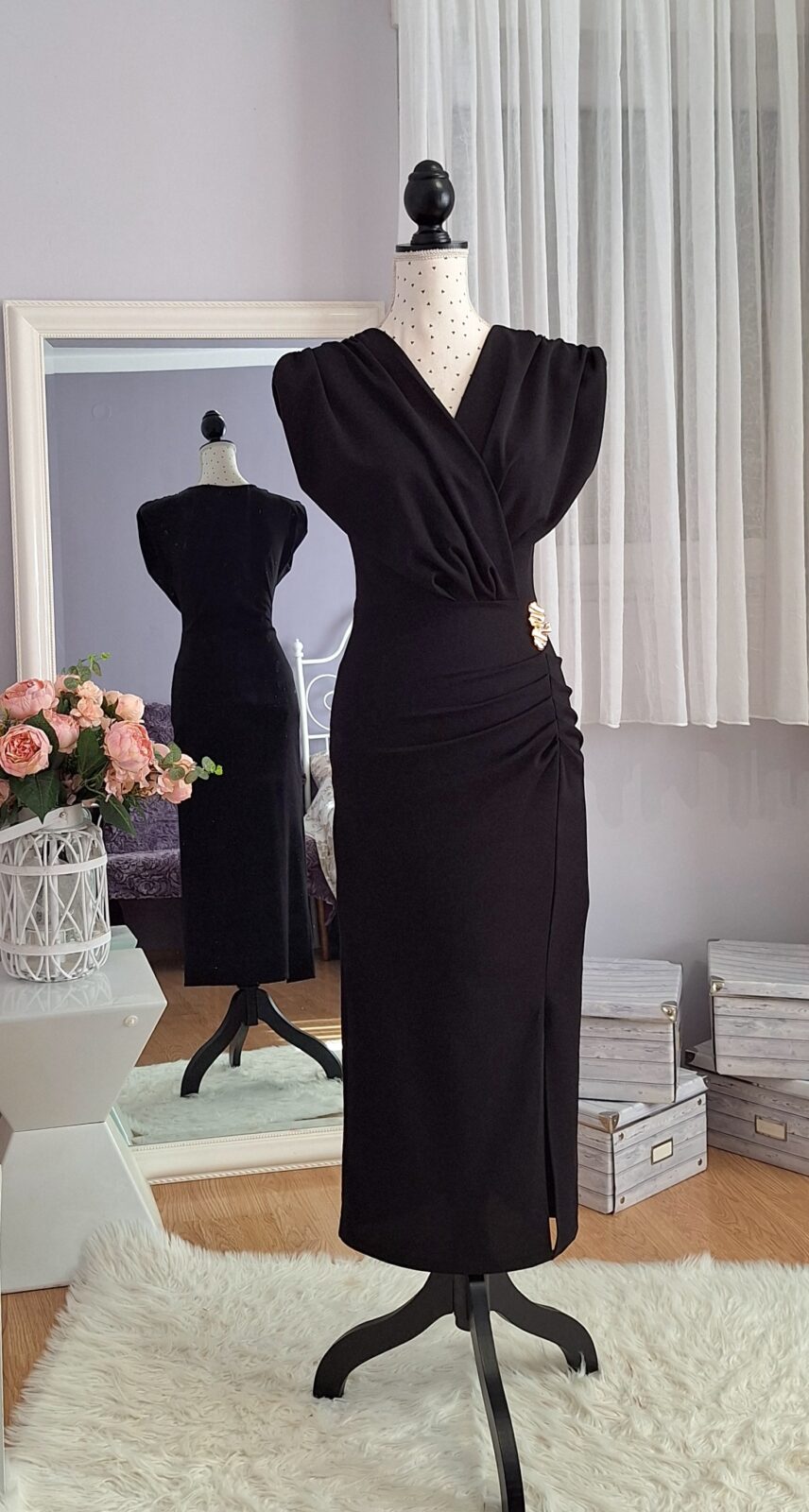 Haljina kratka crne boje sa brošem, uskog kroja, jastučići na ramenima,