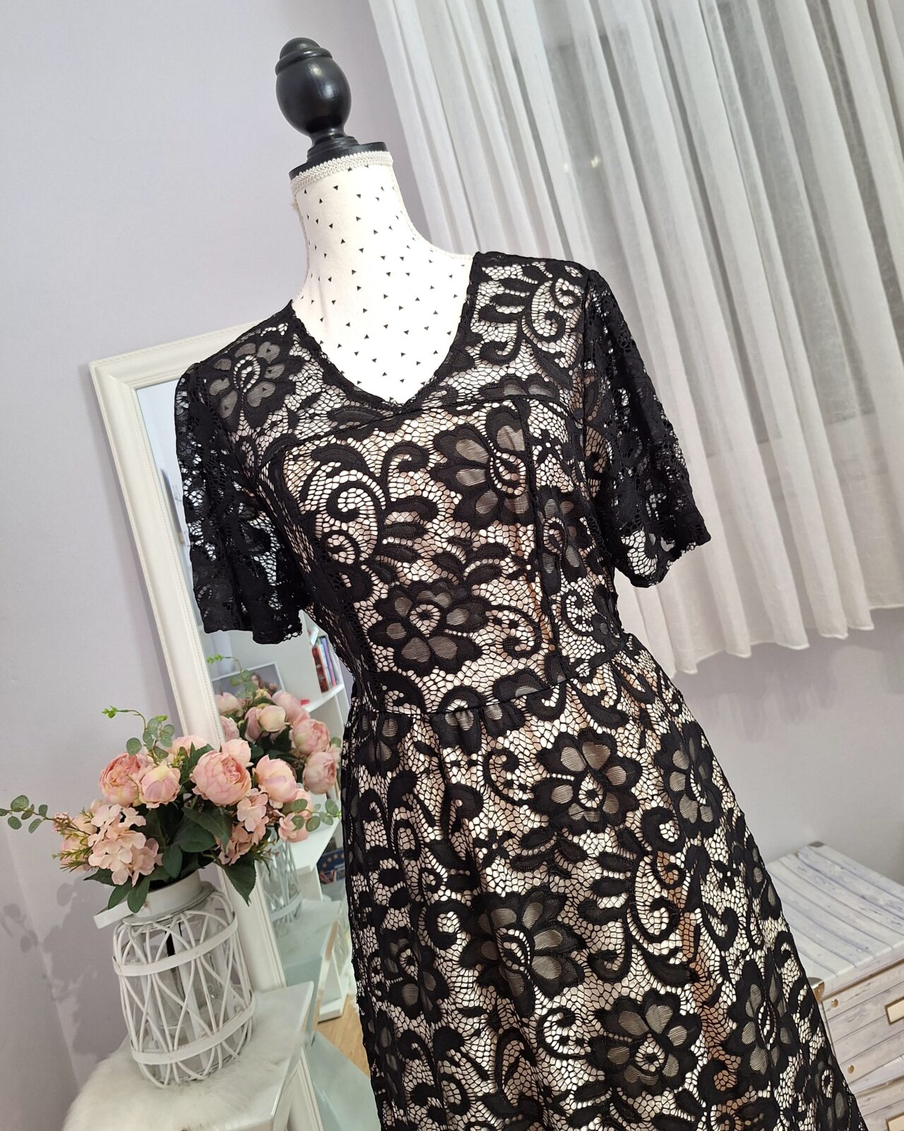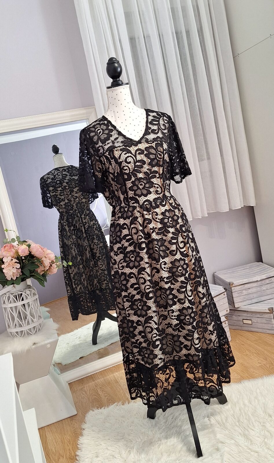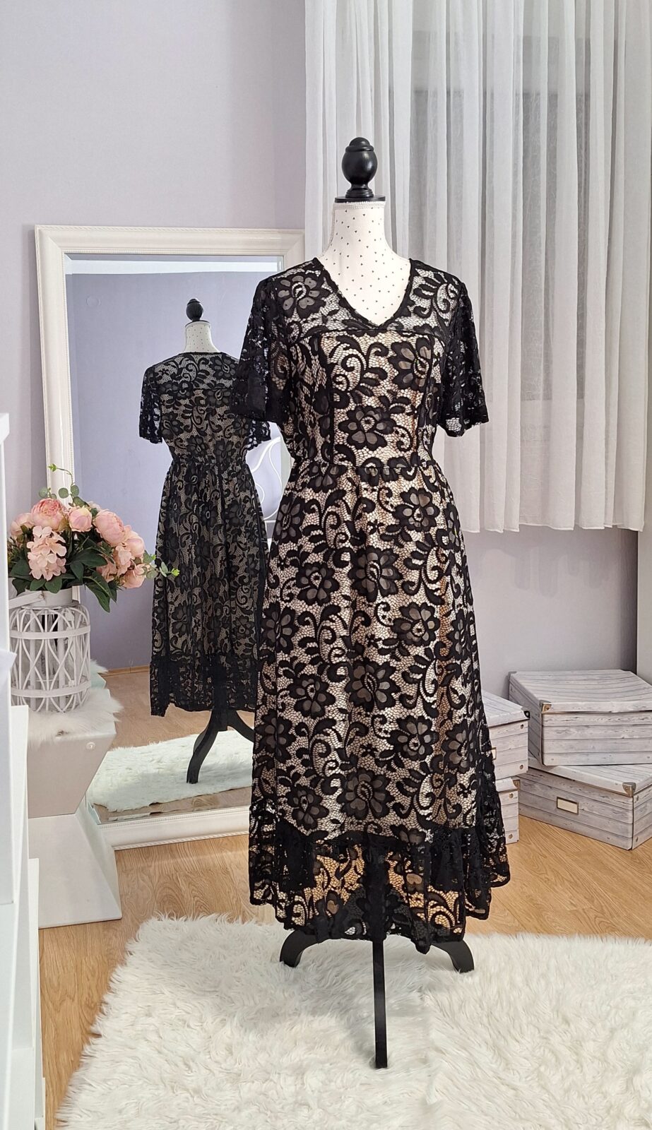Haljina midi crna čipka sa bež podstavom, gumica u struku,