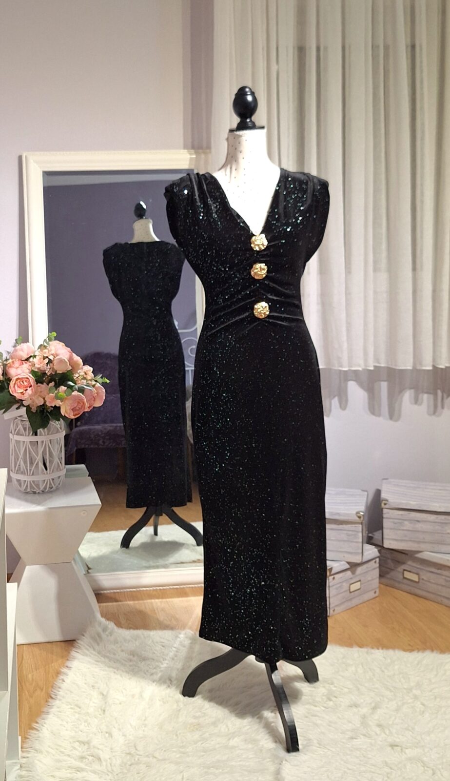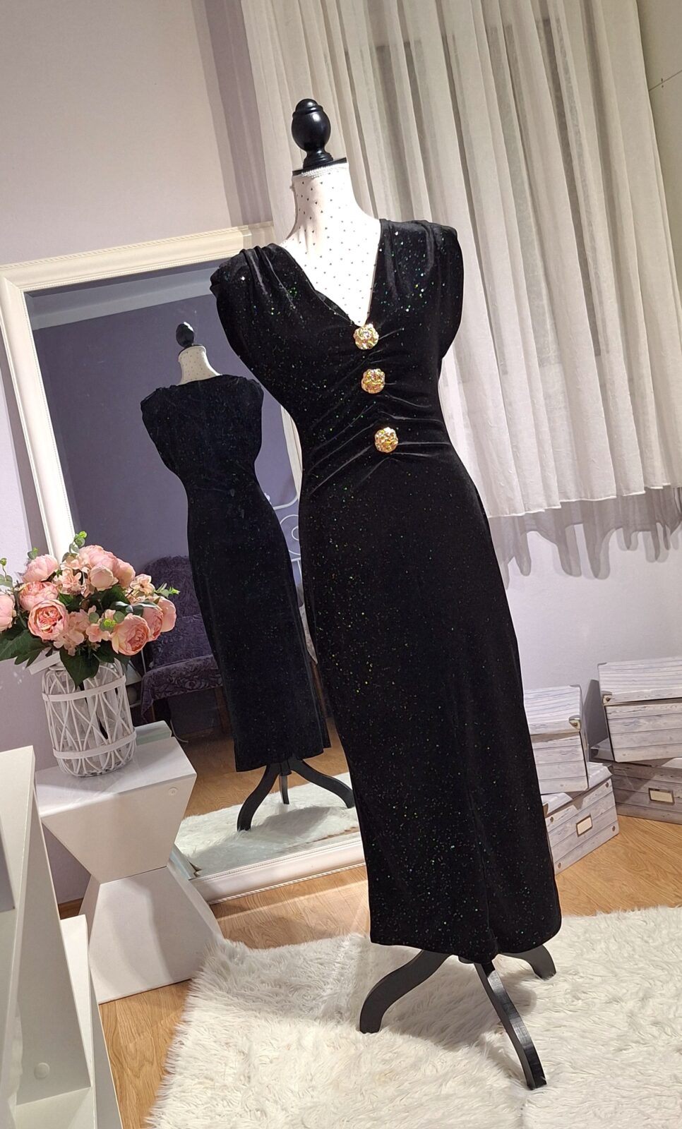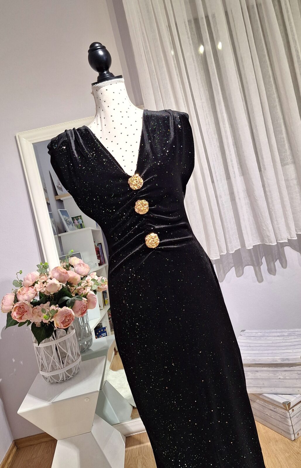 Haljina midi crne boje sa šljokicama, broševi se mogu skinuti,