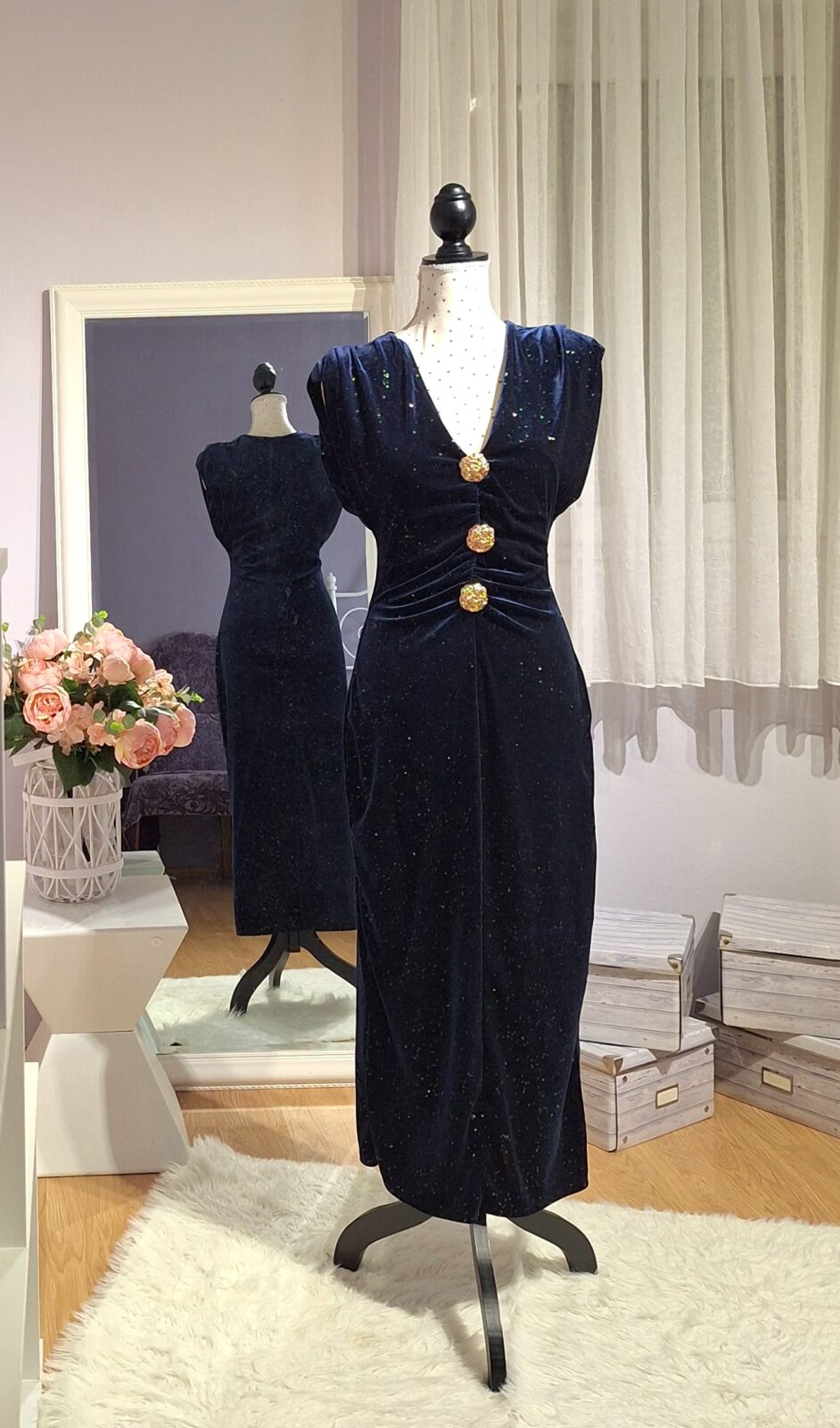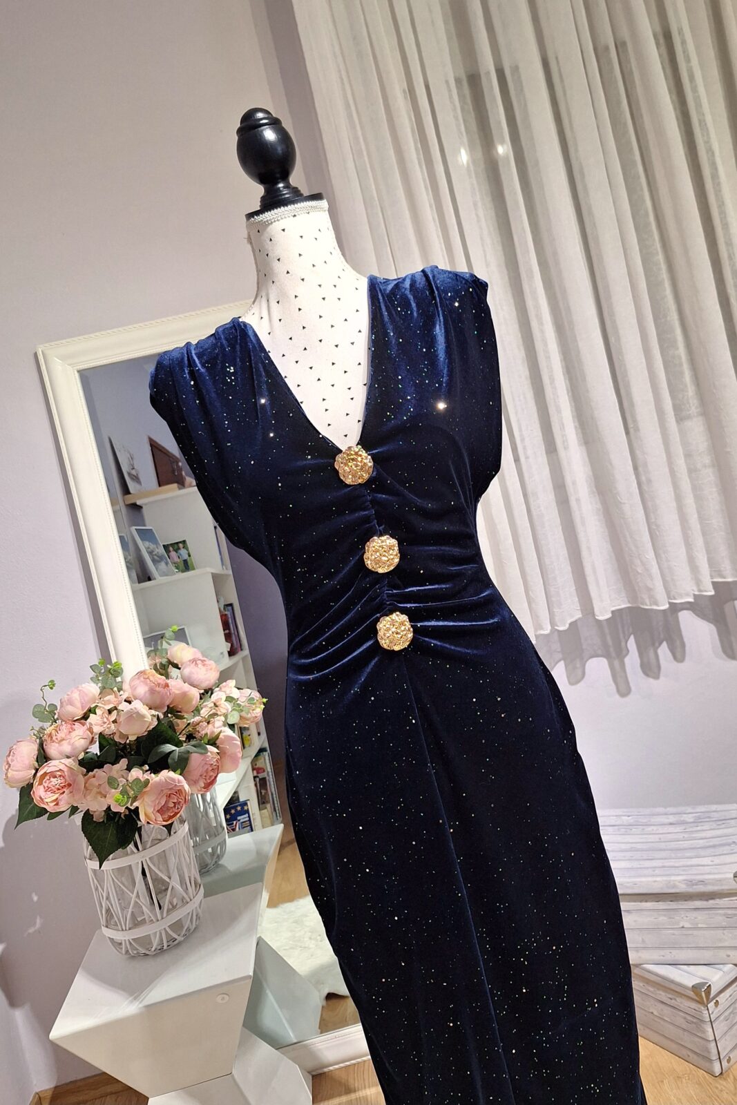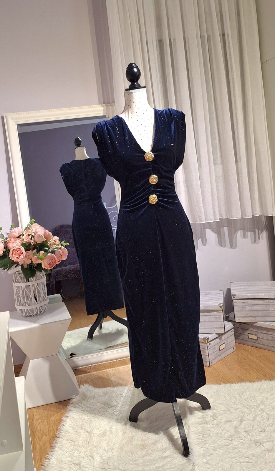 Haljina midi tamno plava sa šljokicama, broševi se mogu skinuti,
