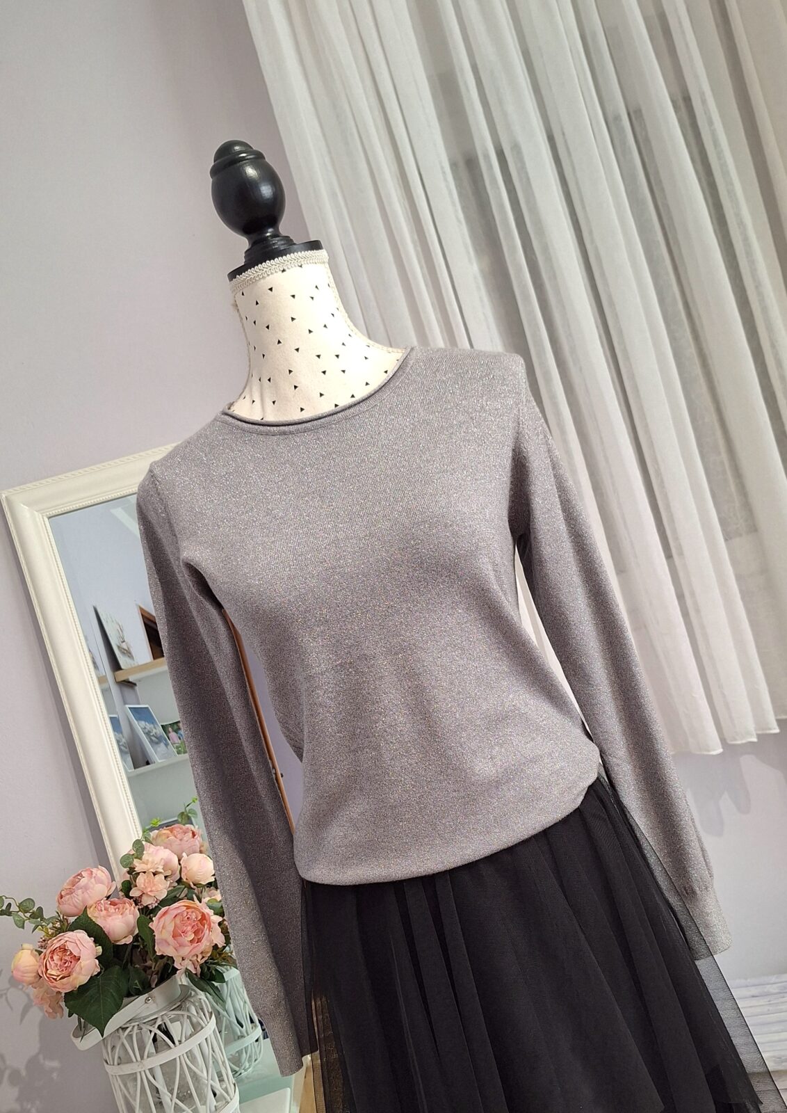 Majica boje srebra sa šljokicama, dugih rukava, ovalni ovratnik, pasica u struku