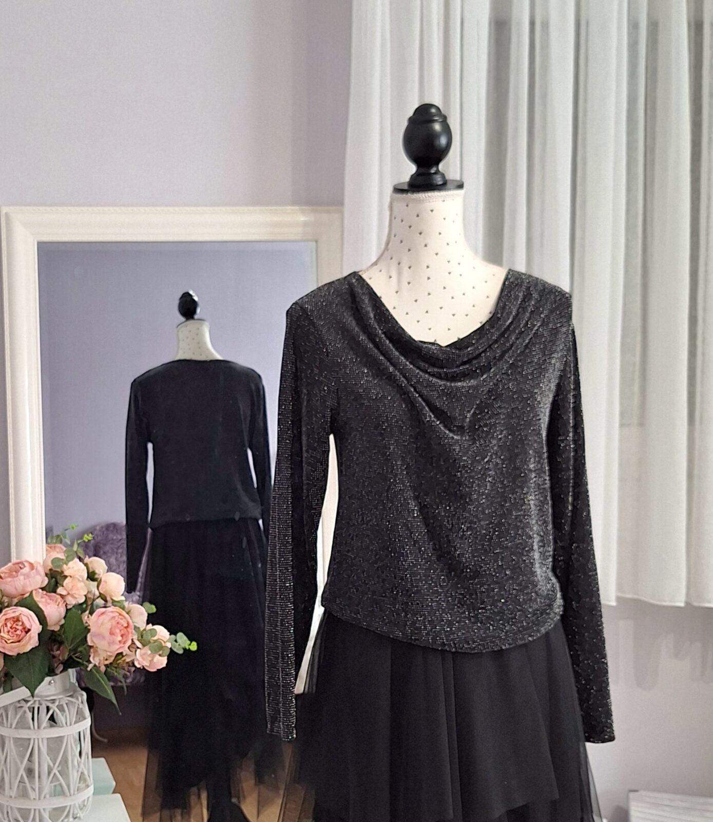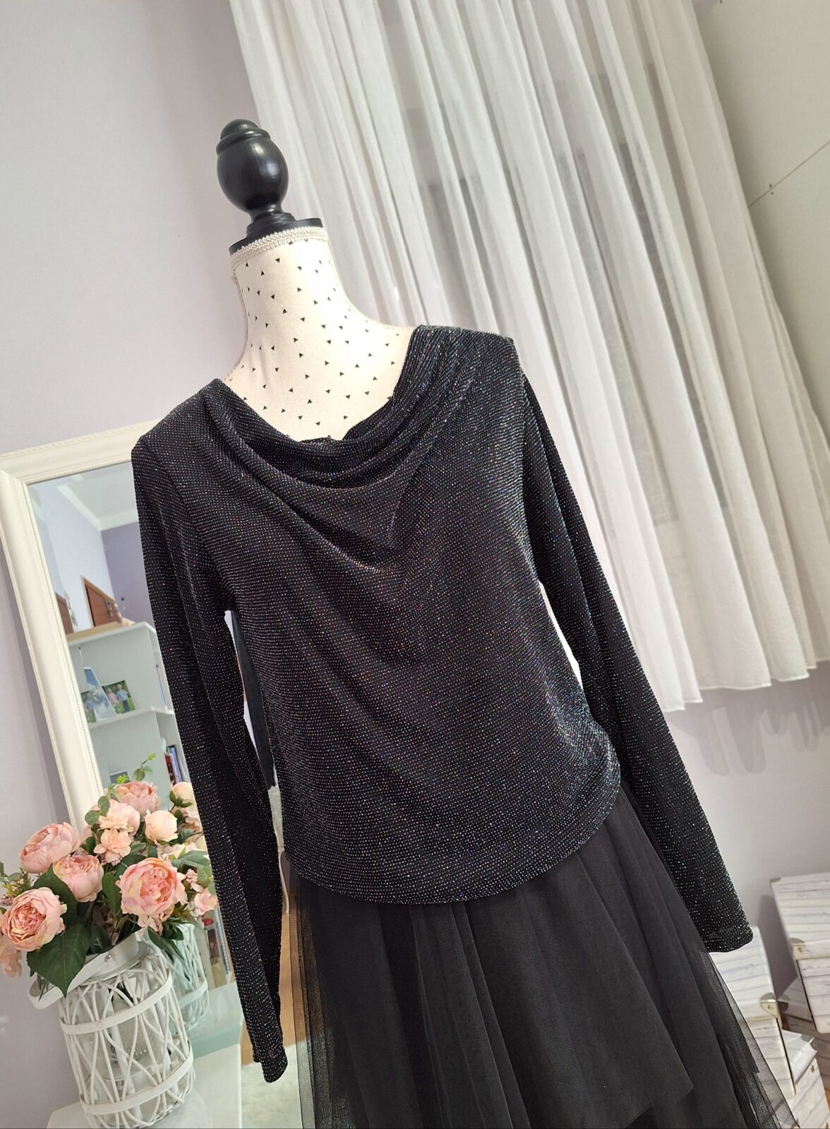 Majica crna sa šljokicama boje srebra dugih rukava, ovalni ovratnik,