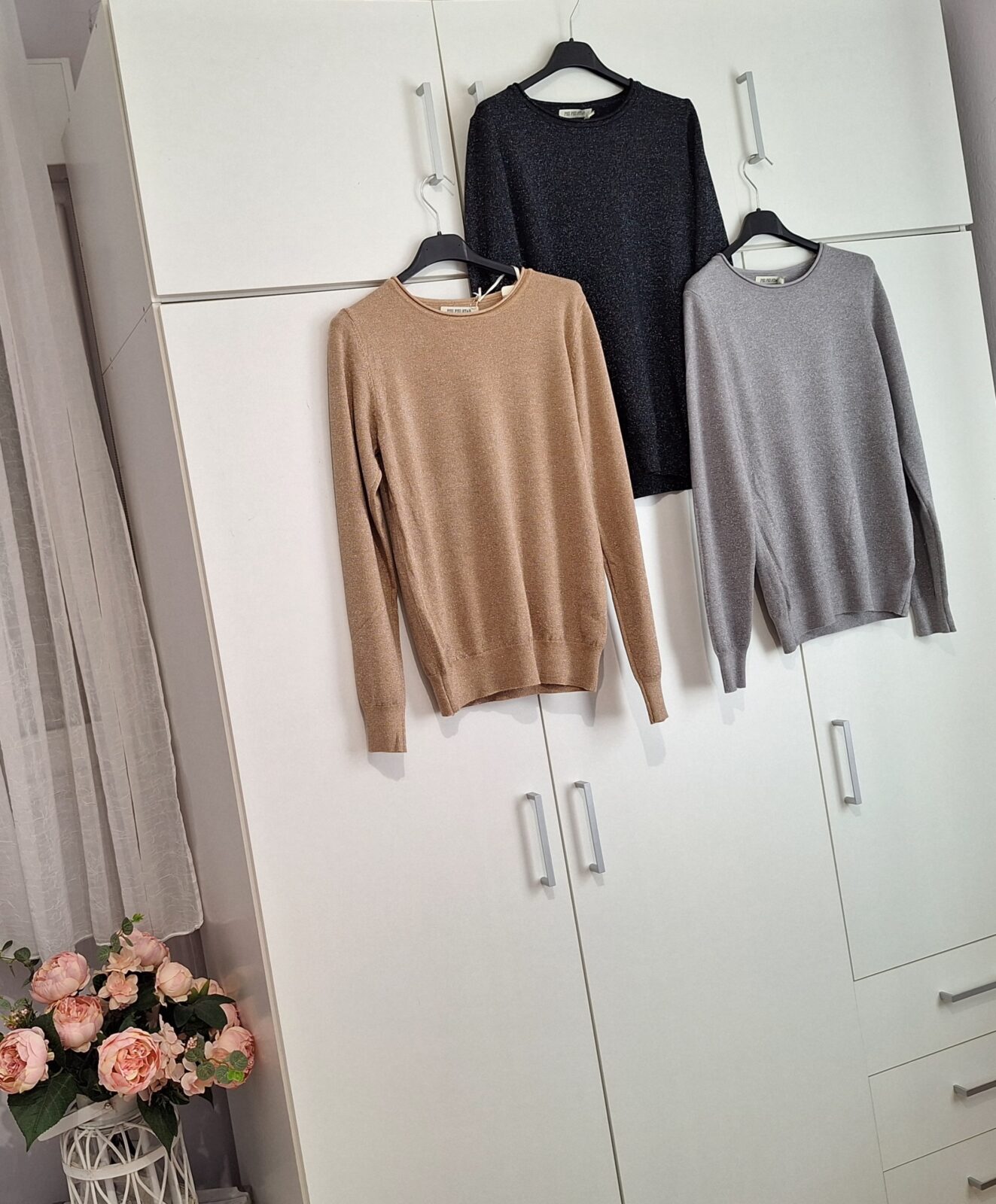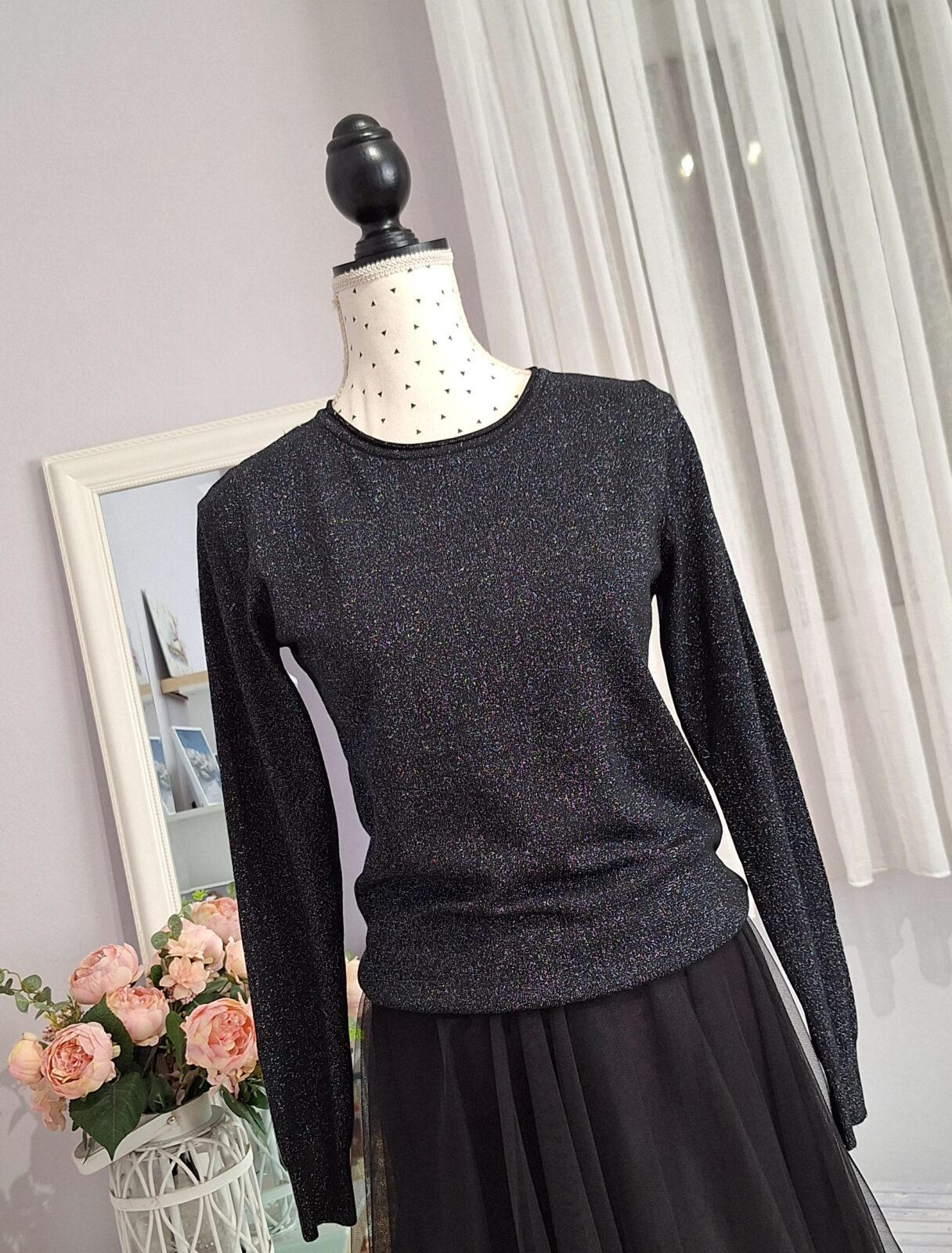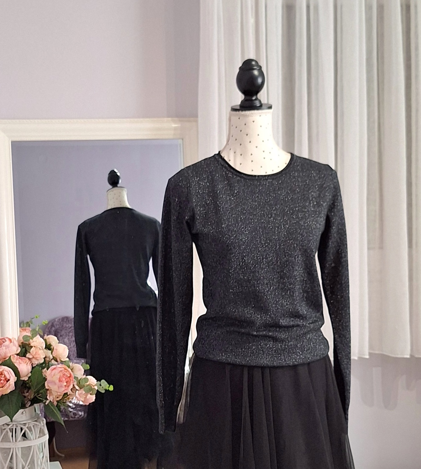 Majica crne boje sa šljokicama, dugih rukava, ovalni ovratnik, pasica u struku